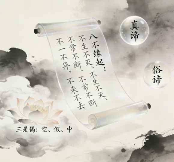 在名言当中,万法皆由因缘和合而生;在胜义当中,诸法首先不生究竟亦不灭,不是常有亦非断灭,不是一体亦非异体,无所从来亦无所去。此颂词是般若智慧的精华,以不灭等八种特点来说明缘起。