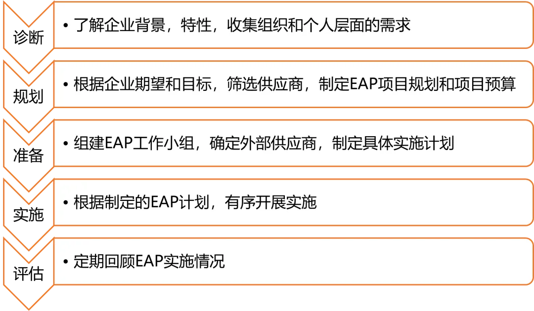 3) 选择适合企业和员工的EAP服务商,比如(1)对企业实际工作情境熟悉擅长培训心理学知识及运用的老师(2)注重理论研究具备心理治疗临床的高校老师(3)对测评的设计原理清晰具备使用资质能够细致解读的测评老师 (4)对某个话题迅速捕捉需求,用教学技巧和群体讨论,轻松愉悦进入开放探讨和应对,增强员工面对的信心,释放负面情绪的引导师等。各类机构与老师的积累与擅长不同,匹配的企业和员工需求不尽相同。