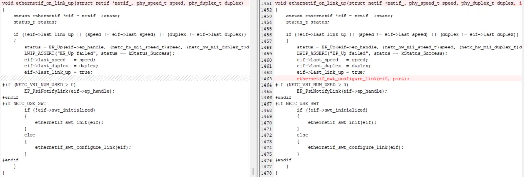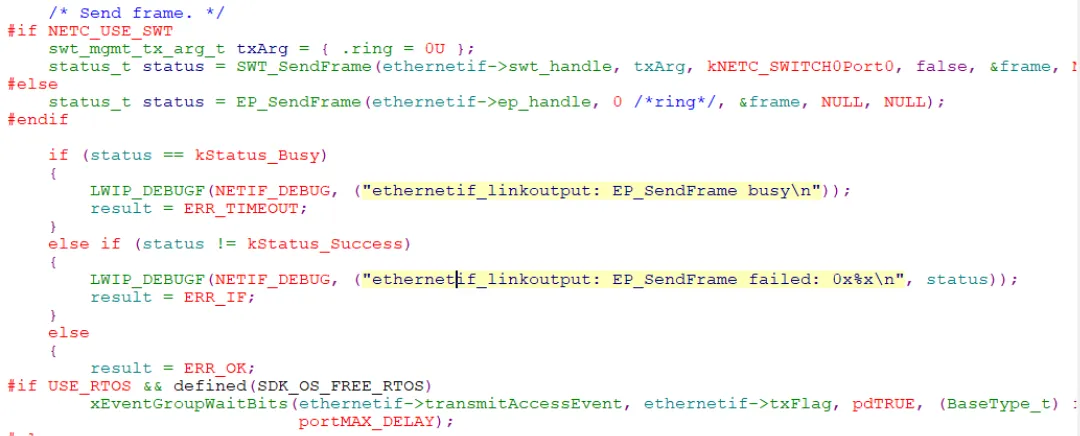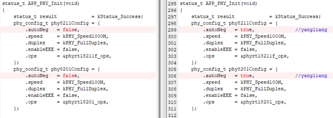 status_tAPP_PHY_Init(void){status_t result = kStatus_Success;phy_config_t phy8211Config = { .autoNeg = true, //yangliang .speed = kPHY_Speed1000M, .duplex = kPHY_FullDuplex, .enableEEE = false, .ops = &phyrtl8211f_ops, };phy_config_t phy8201Config = { .autoNeg = true, //yangliang .speed = kPHY_Speed100M, .duplex = kPHY_FullDuplex, .enableEEE = false, .ops = &phyrtl8201_ops, };/* Reset all PHYs even some are not used in case unstable status has effect on other PHYs. *//* Reset PHY8201 for ETH4(EP), ETH0(Switch port0). Power on 150ms, reset 10ms, wait 150ms. *//* Reset PHY8211 for ETH1(Switch port1), ETH2(Switch port2), ETH3(Switch port3). Reset 10ms, wait 30ms. */ RGPIO_PinWrite(EXAMPLE_EP0_PORT_PHY_RESET_PIN, 0); RGPIO_PinWrite(EXAMPLE_SWT_PORT0_PHY_RESET_PIN, 0); RGPIO_PinWrite(EXAMPLE_SWT_PORT1_PHY_RESET_PIN, 0); RGPIO_PinWrite(EXAMPLE_SWT_PORT2_PHY_RESET_PIN, 0); RGPIO_PinWrite(EXAMPLE_SWT_PORT3_PHY_RESET_PIN, 0); SDK_DelayAtLeastUs(10000, CLOCK_GetFreq(kCLOCK_CpuClk)); RGPIO_PinWrite(EXAMPLE_EP0_PORT_PHY_RESET_PIN, 1); RGPIO_PinWrite(EXAMPLE_SWT_PORT0_PHY_RESET_PIN, 1); RGPIO_PinWrite(EXAMPLE_SWT_PORT1_PHY_RESET_PIN, 1); RGPIO_PinWrite(EXAMPLE_SWT_PORT2_PHY_RESET_PIN, 1); RGPIO_PinWrite(EXAMPLE_SWT_PORT3_PHY_RESET_PIN, 1); SDK_DelayAtLeastUs(150000, CLOCK_GetFreq(kCLOCK_CpuClk));#if 1/* Initialize PHY for EP. */ phy8201Config.resource = &s_phy_resource[EXAMPLE_EP0_PORT]; phy8201Config.phyAddr = BOARD_EP0_PHY_ADDR; result = APP_PHY_SetPort(EXAMPLE_EP0_PORT, &phy8201Config);if (result != kStatus_Success) {return result; } result = APP_Phy8201SetUp(&s_phy_handle[EXAMPLE_EP0_PORT]);if (result != kStatus_Success) {return result; }#endif/* Initialize PHY for switch port0. */ phy8201Config.resource = &s_phy_resource[EXAMPLE_SWT_PORT0]; phy8201Config.phyAddr = BOARD_SWT_PORT0_PHY_ADDR; result = APP_PHY_SetPort(EXAMPLE_SWT_PORT0, &phy8201Config);if (result != kStatus_Success) {return result; } result = APP_Phy8201SetUp(&s_phy_handle[EXAMPLE_SWT_PORT0]);if (result != kStatus_Success) {return result; }/* Initialize PHY for switch port1. */ phy8211Config.resource = &s_phy_resource[EXAMPLE_SWT_PORT1]; phy8211Config.phyAddr = BOARD_SWT_PORT1_PHY_ADDR; result = APP_PHY_SetPort(EXAMPLE_SWT_PORT1, &phy8211Config);if (result != kStatus_Success) {return result; }if (((1U << 2) & EXAMPLE_SWT_USED_PORT_BITMAP) != 0U) {/* Initialize PHY for switch port2. */ phy8211Config.resource = &s_phy_resource[EXAMPLE_SWT_PORT2]; phy8211Config.phyAddr = BOARD_SWT_PORT2_PHY_ADDR; result = APP_PHY_SetPort(EXAMPLE_SWT_PORT2, &phy8211Config);if (result != kStatus_Success) {return result; } }if (((1U << 3) & EXAMPLE_SWT_USED_PORT_BITMAP) != 0U) {/* Initialize PHY for switch port3. */ phy8211Config.resource = &s_phy_resource[EXAMPLE_SWT_PORT3]; phy8211Config.phyAddr = BOARD_SWT_PORT3_PHY_ADDR; result = APP_PHY_SetPort(EXAMPLE_SWT_PORT3, &phy8211Config);if (result != kStatus_Success) {return result; } }return result;}