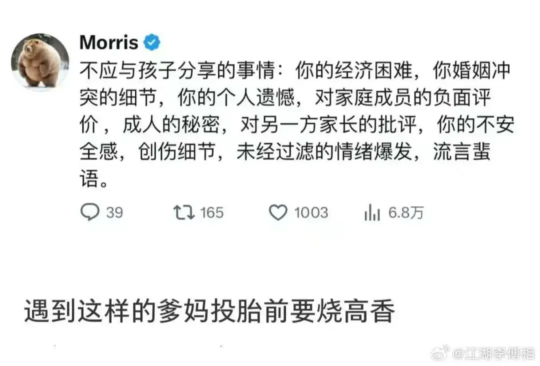 鲁迅非常经典的一段话:父母存在的意义,不是给予孩子舒适和富裕的生活,而是当你想起父母的时,你的内心会充满力量,会感受到温热,从而拥有克服困难的勇气和能力!因此获得人生真正的乐趣和自由!