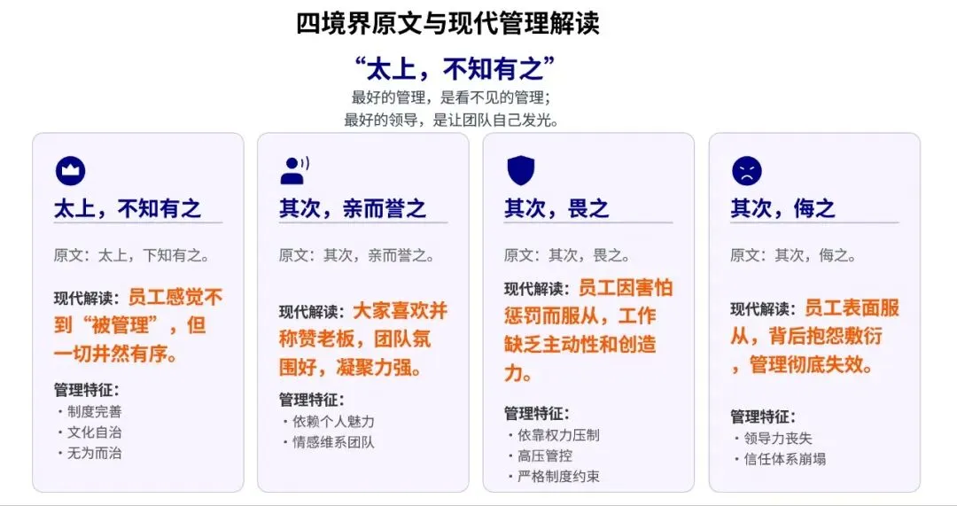 《道德经》讲管理有四重境界:“太上,不知有之;其次,亲而誉之;其次,畏之;其次,侮之。”最高明的管理者,大家感觉不到他的存在——因为一切运行良好,没有问题需要他“英雄式出场”。