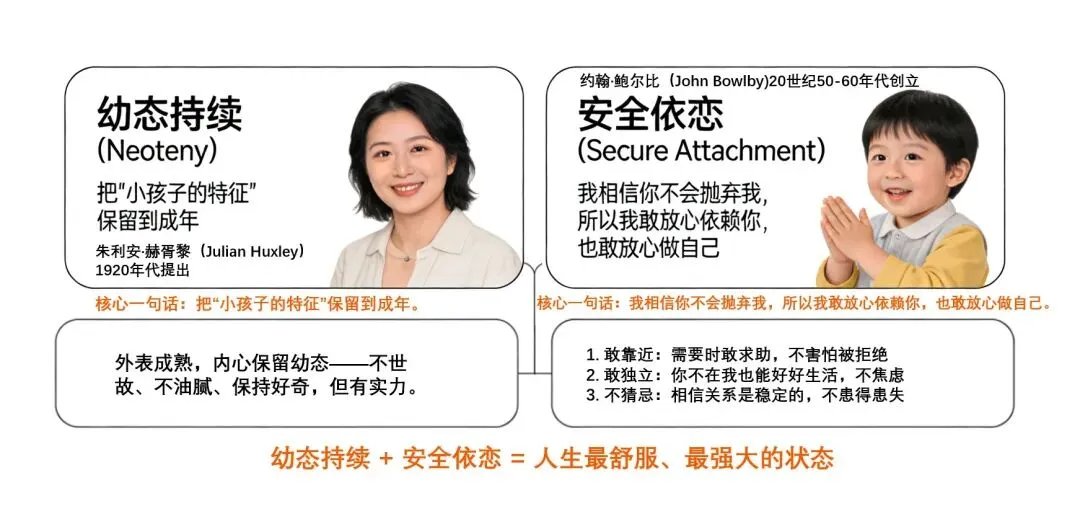 幼态持续+安全依恋=人生最舒服、最强大的状态:我保留天真、柔软、好奇,但我内心笃定、安全、不缺爱。让人想保护,又让人放心依靠。