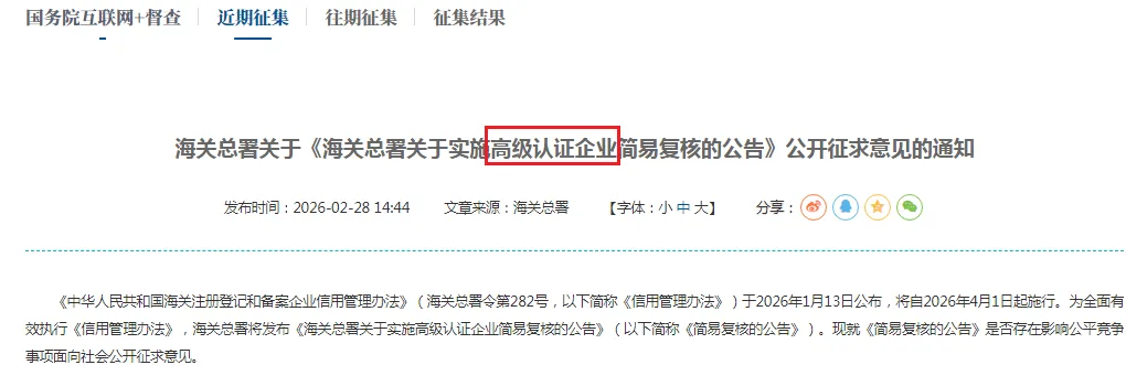 根据【(海关总署令第282号)第二十三条 海关开展复核,应当提前通知企业,并参照认证程序实施。符合海关规定条件的,可以简化复核程序。】海关关总署将发布《海关总署关于实施高级认证企业简易复核的公告》公开征求意见。如下是小编的学习笔记,希望起到抛砖引玉的作用。