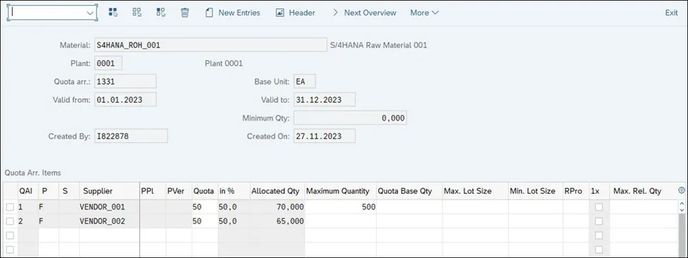 对于每个有效期,可以确定项目;每个项目将代表一个可能的供应来源以及相应的采购类型、特殊采购类型和分配的配额,如下图所示。