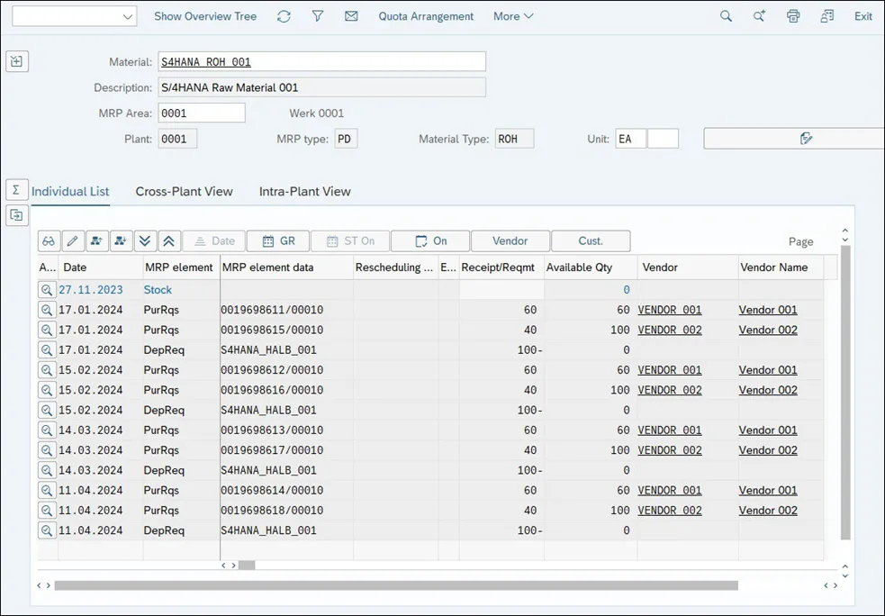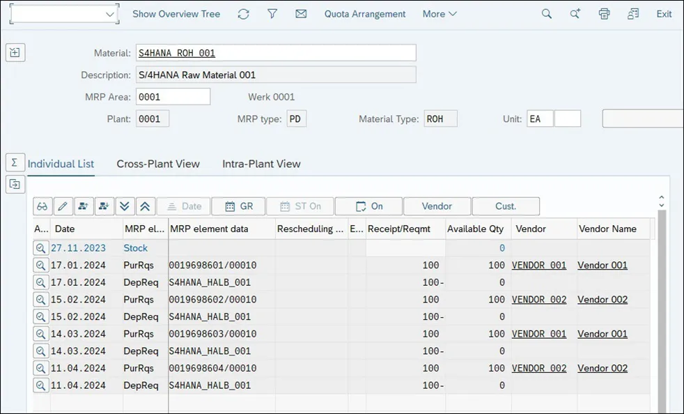 下图显示了分配配额安排的 MRP 结果。请注意,对于每次短缺,MRP 都会创建一个补货建议,选择配额安排中定义的供应来源之一。对于为弥补后续短缺而创建的补货建议,MRP 将选择下一个供应源,尝试保持分配数量的余额。