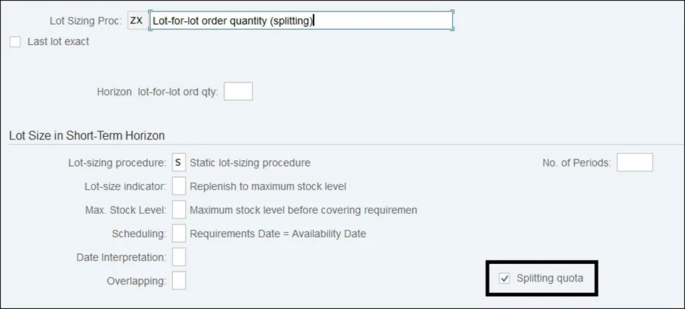 使用拆分配额时,MRP 将忽略分配的数量,并且对于每个短缺,将在不同的供应来源之间拆分补货建议。可以通过在批量大小程序定制(事务码 OMI4)中设置相应的标志来激活分割配额。默认情况下,在标准批量大小程序中不勾选 分割配额 设置。可能必须创建自己的批量大小程序作为标准程序的副本,并将此标志设置为使用拆分配额,如下图所示。