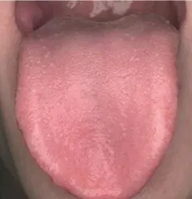 像一间老旧的墙面开始掉漆,有些地方还残留着涂层,但大部分已经剥落,看起来坑坑洼洼的。剥落苔的形成通常是由于胃气不足、胃阴虚、津液不足导致的。如果舌面完全剥落,说明身体处于严重的虚弱状态,需要及时补充津液和营养。治疗:饮食上需要加强滋阴、补养,比如多食用豆浆、牛奶、芝麻、核桃等有滋补作用的食物。⑧偏全苔