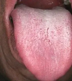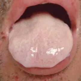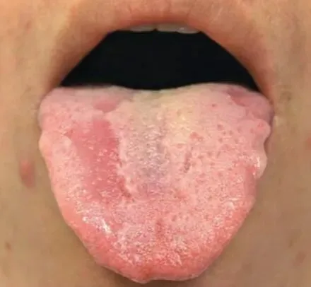 像涂满了一层厚厚的奶油,完全覆盖了舌头底色,遮住了它原本的样子,就像霜冻后的玻璃上满是冰霜。厚苔说明舌面的堆积物变厚,这通常是由于体内湿气堆积、或者寒湿邪气引起的。舌面上的这些黏腻物,是由体内的“垃圾”堆积而成的。治疗:适当调整饮食,减少食用油腻和辛辣的食物,多吃清淡易消化的食品。同时适当的运动可以帮助身体排出湿气。③润滑苔