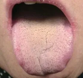 燥苔通常由于体内津液消耗太多,导致舌面干燥。如果有颜色暗红或者裂纹的情况,可能提示阴虚、内热等问题,导致人体津液损伤。若舌苔白厚腻且干燥的话,可能是因为阳气受痰饮水湿等困阻,导致津液无法正常输布,从而形成了燥苔。治疗:保证充足水分的摄入,避免食用过多辛辣食物。要调整作息,减少熬夜。⑤腻苔