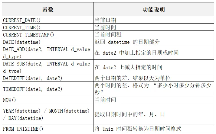 MySQL 中的日期函数是专门处理 DATE(日期)、DATETIME(日期时间)、TIMESTAMP(时间戳)等日期时间类型数据的工具,常用于获取当前时间、提取年月日时分秒、计算日期差值、格式化日期等场景(比如处理订单创建时间、用户注册时间、生日计算等)。我们对于表中的函数进行举例,看看它们在sql语句中是怎么发挥作用的:-- 提取当前日期的“年”部分SELECT YEAR(NOW()) FROM DUAL;-- 提取当前日期的“日”部分SELECT DAY(NOW()) FROM DUAL;-- 提取指定日期的“月”部分SELECT MONTH('2013-11-10') FROM DUAL;-- unix_timestamp():返回的是1970-1-1 到现在的秒数SELECT UNIX_TIMESTAMP() FROM DUAL;-- FROM_UNIXTIME():可以把一个 unix_timestamp 秒数[时间戳],转成指定格式的日期-- %Y-%m-%d 格式是规定好的,表示年月日SELECT FROM_UNIXTIME(1618483484, '%Y-%m-%d') FROM DUAL;SELECT FROM_UNIXTIME(1618483100, '%Y-%m-%d %H:%i:%s') FROM DUAL;