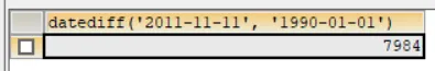 -- 请在mysql 的sql语句中求出2011-11-11 和 1990-1-1 相差多少SELECT DATEDIFF('2011-11-11', '1990-01-01') FROM DUAL;
