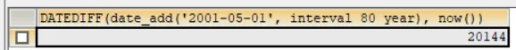 -- 如果你能活80岁,求出你还能活多少天SELECT DATEDIFF(DATE_ADD('2001-05-01', INTERVAL 80 YEAR), NOW())FROM DUAL;