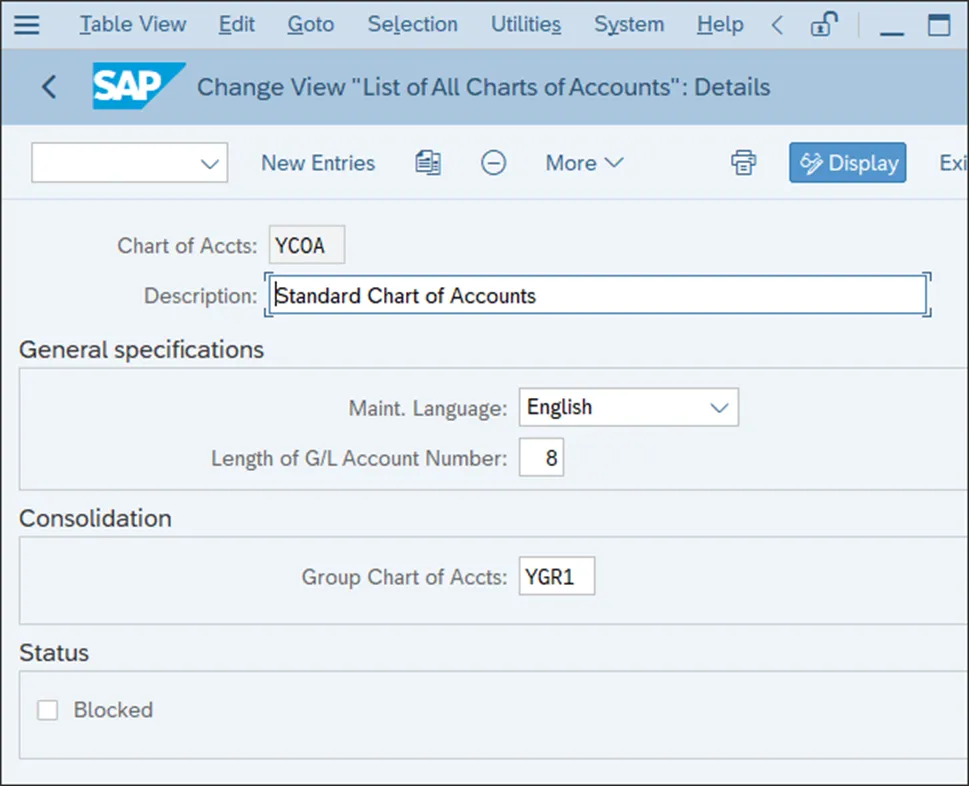 现在,让我们来检查会计科目表的设置。 请按照菜单路径“财务会计 • 总账会计 • 主数据 • 总账科目 • 准备工作 • 编辑会计科目表列表”操作,或者输入事务代码 OB13。下图显示了系统中定义的会计科目表列表。SAP S/4HANA 为一些国家提供了作为最佳实践内容的示例会计科目表。双击列表下方的 YCOA 会计科目表(标准会计科目表),将打开如下图所示的屏幕。- 维护语言:维护会计科目表的总账科目所使用的主要语言。总账科目可以有其他语言的描述,但在此字段中,您将指定该国使用的主要语言。