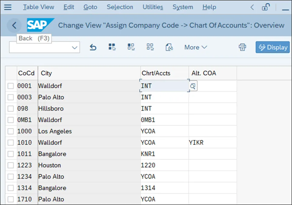 完成对这些设置的审查或更改后,保存并继续进行下一个配置事务,将会计科目表分配给公司代码。请按照菜单路径“财务会计 • 总账会计 • 主数据 • 总账科目 • 准备工作 • 将公司代码分配给会计科目表”操作,或者输入事务代码 OB62。在下图所示的屏幕上,将会计科目表分配给您的公司代码。在上图所示的表格中,您将看到已创建的公司代码列表,并且可以在以下列中进行分配:- 替代会计科目表:公司代码要使用的替代本地国家会计科目表。