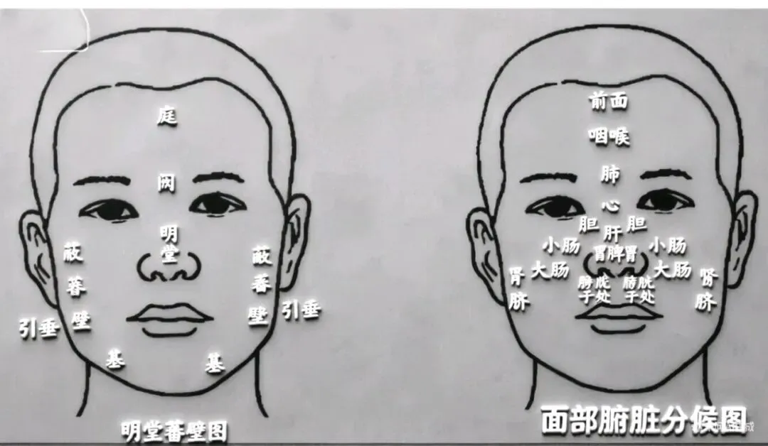 🔍 难点注解与记忆技巧注解: 眉心正中对应肺。这是肺的“天窗”,也是望诊中判断肺气盛衰的重要位置。记忆法: 肺在五脏中位置最高,如同“阙”(古代宫殿门前的楼台),故居于面部高处。注解: 指两眼内眼角之间的鼻根部(山根)。此处为“王宫”,对应心。因为心为君主之官,居于肺之下,故称下极。注解: 从山根(心)向下,沿鼻梁正中线,对应肝。肝的旁边(左侧,即观者视角的右侧)对应胆。注意: 这里体现了“左肝右肺”的传统方位观,且胆附于肝,故在肝的侧方。下者,脾也: 指鼻尖(准头)正下方的位置,或者理解为鼻尖本身主脾(不同注家略有差异,通常认为鼻头色黄主脾)。方上者,胃也: 指鼻翼的外侧(鼻唇沟上方)。因为胃与脾相表里,且胃经循行于面部,故位于鼻翼旁。难点解析:这里的“中央”并非指整张脸的正中心,而是指鼻翼区域(在面部色诊图中,鼻翼被称为“面王”的两侧)。字面意思:夹在大肠区域旁边(或下方)的部位,对应肾脏。“挟”的理解:这里的“挟”不是左右夹击,而是指位置邻近。在面部图谱中,肾脏的反射区通常位于鼻翼外下方的颧骨下缘,或者在眼下的区域。“当”的理解:“当”在这里是“正对”、“正下方”或“同一直线”的意思。定位: 鼻头(面王)以上的区域(包括鼻梁、鼻根)对应小肠。这与现代解剖学中小肠居于上腹部、胃下方的位置看似不符,但在经络联系上,手太阳小肠经“上颊至目锐眦”,与面部联系紧密。注解: 鼻头(面王)向下延伸的区域(人中沟),对应膀胱和子宫(子处)。人中深浅、色泽常用于判断泌尿生殖系统及津液状况。“头额庭,眉心肺,山根心,鼻柱肝,鼻头脾,两颧肾,左颊肝,右颊肺。”第二部分:五色主病(图例)