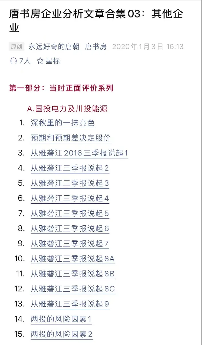 在阅读的过程中,对我帮助最大的是老唐2016年关于水电的一系列文章,以及傲雪关于长电和国投的一系列文章,在此表示感谢,并强烈推荐对水电感兴趣的读者,把这些文章都翻出来,读一读。