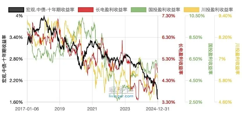 2016/12/31~2024/12/31,10年国债利率从3.0%降至1.7%,带动水电行业估值扩张(盈利收益率=1/市盈率,盈利收益率走低意味着市盈率走高)
