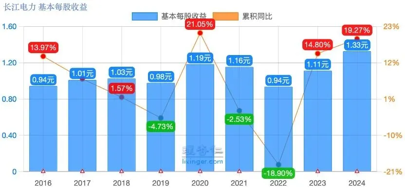 长江电力EPS从0.94增长到1.33,CAGR 4.4%