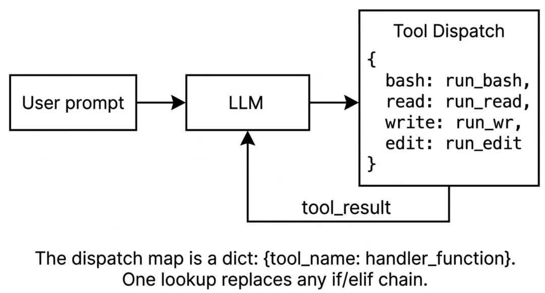 TOOL_HANDLERS = {"bash": lambda **kw: run_bash(kw["command"]),# ..."edit_file": lambda **kw: run_edit(kw["path"], kw["old_text"], kw["new_text"]),}