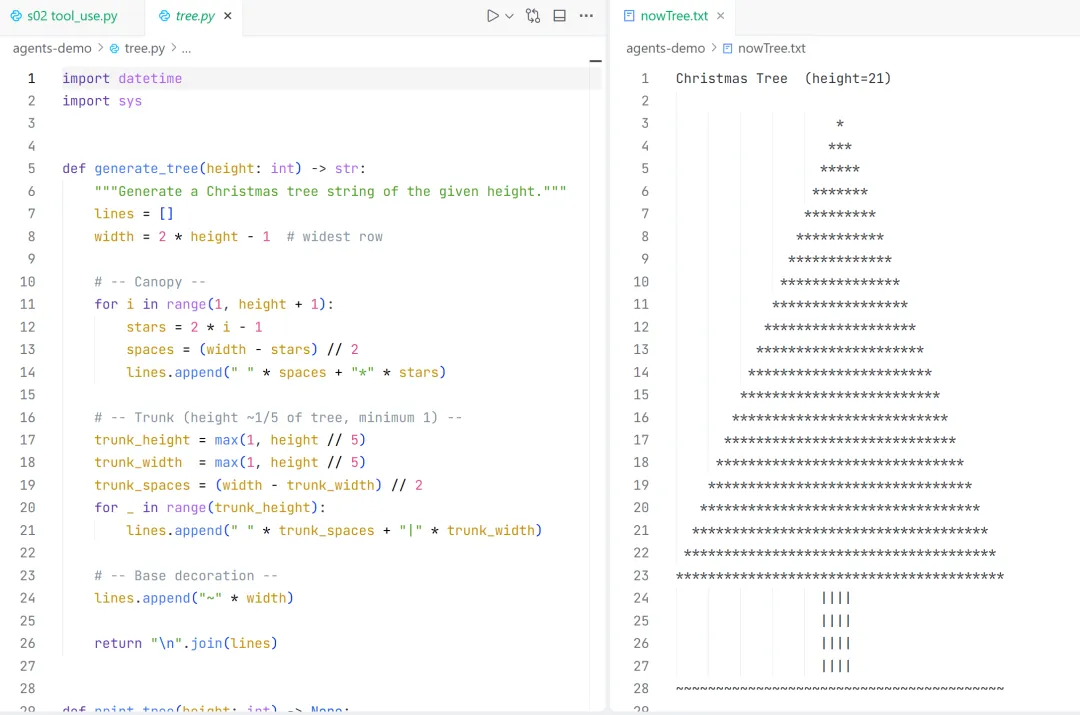 (llm) D:\code\Agent\learn-claude-code>python agents\s02_tool_use.py选择模型:1. claude-sonnet-4-62. gemini-2.5-flash3. gpt-3.5-turbo4. deepseek-chat5. deepseek-r16. glm-4.57. qwen-plus8. kimi-k2.59. MiniMax-M2.110. 自定义输入模型编号(回车沿用: deepseek-chat)>> 1s01 (claude-sonnet-4-6) >> 新建一个可以输出任意高度圣诞树的tree.py,结束后执行时指定当前小时数大小的 圣诞树输出到nowTree.txtToken 消耗: Usage(cache_creation=CacheCreation(ephemeral_1h_input_tokens=0, ephemeral_5m_input_tokens=0), cache_creation_input_tokens=0, cache_read_input_tokens=0, inference_geo='not_available', input_tokens=1086, output_tokens=68, server_tool_use=None, service_tier='standard')[Tool] bash: 21当前小时数是 **21**,现在来创建 `tree.py`:Token 消耗: Usage(cache_creation=CacheCreation(ephemeral_1h_input_tokens=0, ephemeral_5m_input_tokens=0), cache_creation_input_tokens=0, cache_read_input_tokens=0, inference_geo='not_available', input_tokens=1167, output_tokens=803, server_tool_use=None, service_tier='standard')[Tool] write_file: Error: 'gbk' codec can't encode character '\U0001f384' in position 973: illegal multibyte sequenceToken 消耗: Usage(cache_creation=CacheCreation(ephemeral_1h_input_tokens=0, ephemeral_5m_input_tokens=0), cache_creation_input_tokens=0, cache_read_input_tokens=0, inference_geo='not_available', input_tokens=2011, output_tokens=652, server_tool_use=None, service_tier='standard')[Tool] write_file: Wrote 1737 bytes to D:\code\Agent\agents-demo\tree.pyToken 消耗: Usage(cache_creation=CacheCreation(ephemeral_1h_input_tokens=0, ephemeral_5m_input_tokens=0), cache_creation_input_tokens=0, cache_read_input_tokens=0, inference_geo='not_available', input_tokens=2696, output_tokens=69, server_tool_use=None, service_tier='standard') ... ***************Token 消耗: Usage(cache_creation=CacheCreation(ephemeral_1h_input_tokens=0, ephemeral_5m_input_tokens=0), cache_creation_input_tokens=0, cache_read_input_tokens=0, inference_geo='not_available', input_tokens=2904, output_tokens=65, server_tool_use=None, service_tier='standard') **...******* (height=21)完成!以下是整体说明:---### `tree.py` 功能说明| 特性 | 说明 ||------|------|| **任意高度** | `generate_tree(height)` 接受任意正整数,动态计算树冠、树干、底座 || **树冠** | 从顶部 `*` 逐行展开,每行星号数 = `2i-1`,自动居中 || **树干** | 高度与宽度均为总高度的 `1/5`(至少 1),用 `\|` 表示 || **底座** | 用 `~` 填满整行宽度 || **命令行使用** | `python tree.py <高度> [输出文件]` || **默认行为** | 无参数时自动取 **当前小时数** 作为高度 |### 本次执行### 本次执行- 当前时间:**21 时** → 高度 = **21**- 圣诞树已同步输出到控制台并保存至 **`nowTree.txt`** ✅Token 消耗: Usage(cache_creation=CacheCreation(ephemeral_1h_input_tokens=0, ephemeral_5m_input_tokens=0), cache_creation_input_tokens=0, cache_read_input_tokens=0, inference_geo='not_available', input_tokens=3110, output_tokens=318, server_tool_use=None, service_tier='standard')