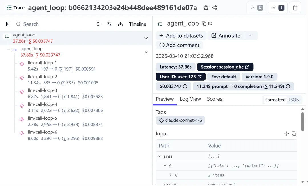 Token 消耗打点:获取到 response.usage 后,通过 generation.update(usage=...) 将输入输出 Token 精确绑定到当前的生成节点上,方便后续计算成本。