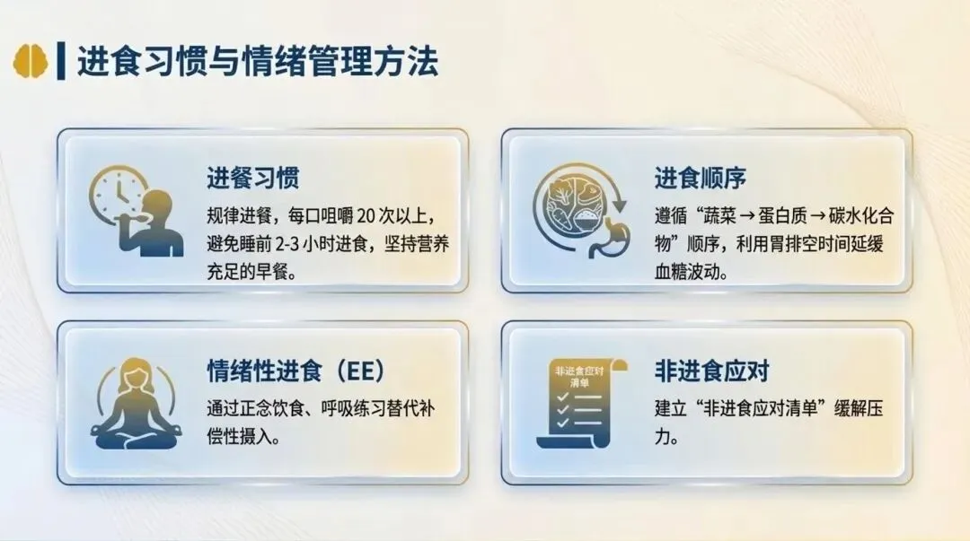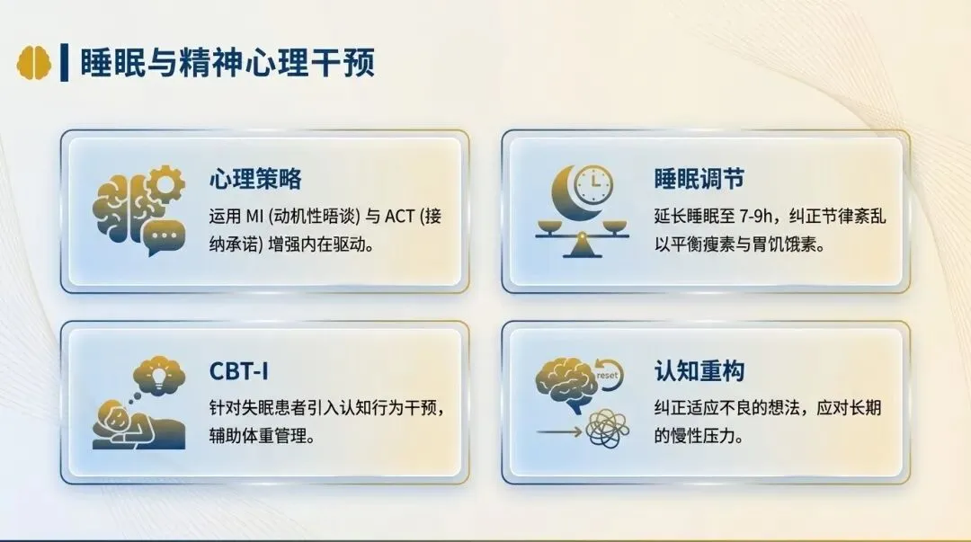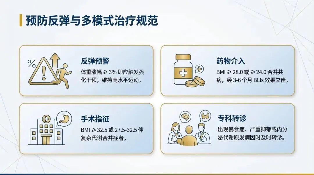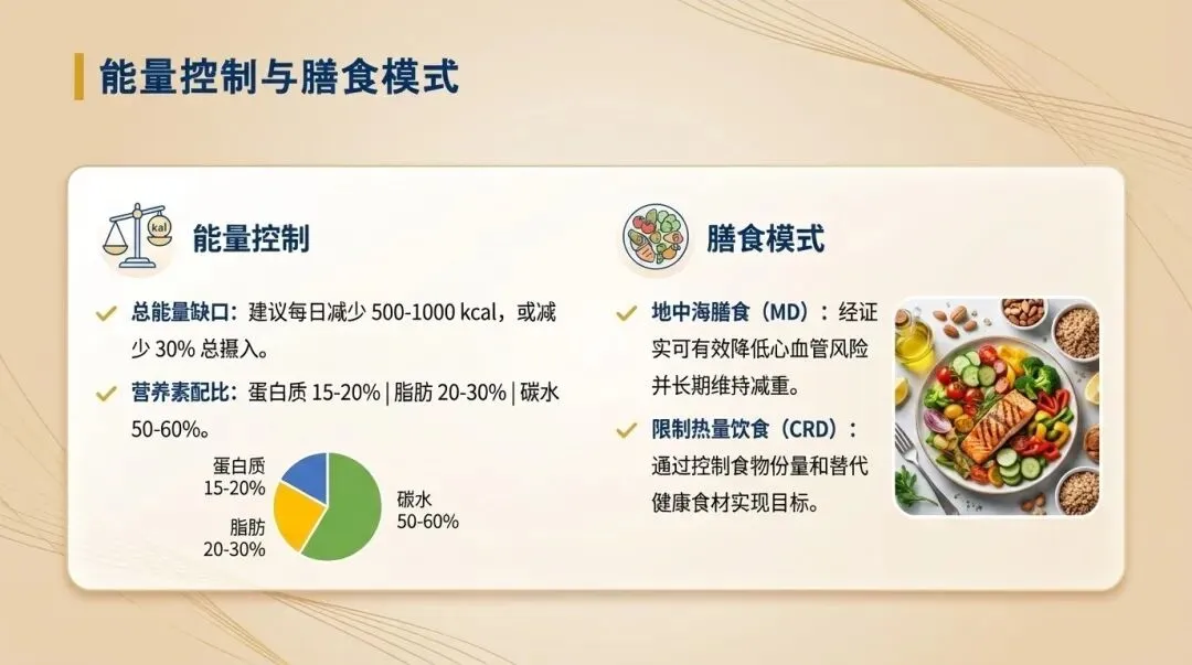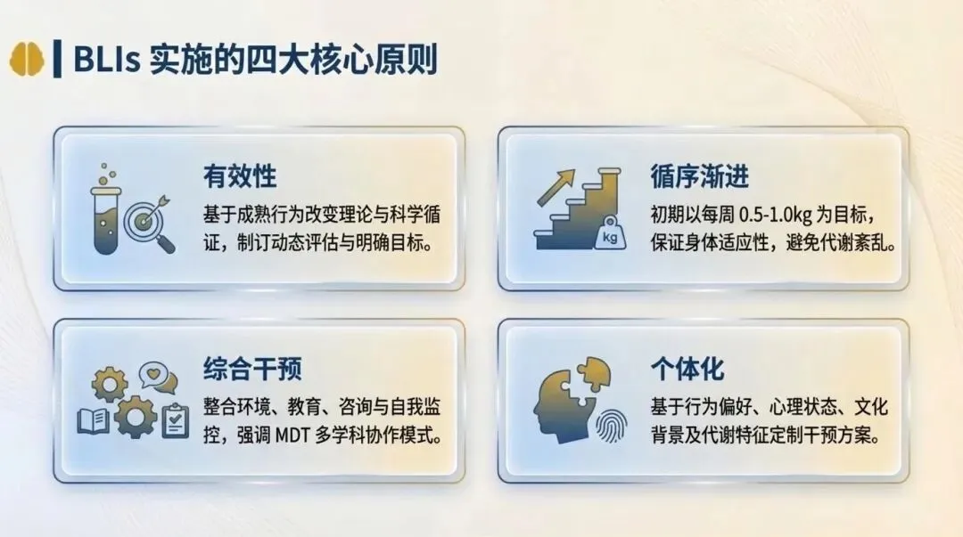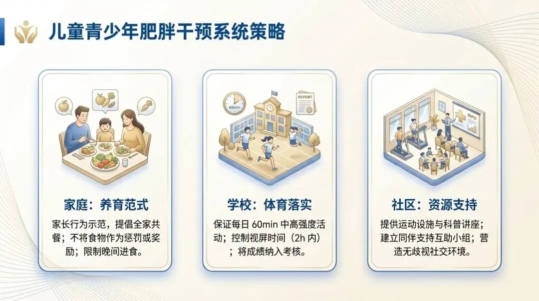 2. 行为与生活方式干预(BLIs)的原则与基础策略四大原则:实施干预需遵循有效性、循序渐进、综合干预和个体化原则。基础策略:强调基于成熟的理论(如计划行为理论、健康信念模式等),有效运用行为改变技术(如目标设定、自我监控、刺激控制等),以及采用认知行为疗法(CBT)和回授法健康教育来支持干预。膳食行为干预:核心是控制总能量摄入(每日减少500~1000 kcal),坚持如地中海等健康膳食模式,并科学管理进食的时间、方式(如细嚼慢咽、改变烹饪方式)、地点及情绪性进食。运动行为干预:推荐有氧运动、抗阻训练、高强度间歇训练等方式,打破静态生活模式。 指南还提供了开具个性化运动处方(包括运动频率、强度、时长等)的详细流程。心理健康干预:针对肥胖者易出现的压力、抑郁和情绪性进食,提出通过动机性晤谈、认知行为干预(CBT)、接纳与承诺疗法及正念进食等方式进行干预。睡眠行为干预:通过教育、放松训练、光疗法及认知行为干预等手段改善睡眠时间不足和睡眠障碍,以维持代谢稳态。4. 干预的流程与实施步骤建立了一套标准化的干预实施闭环,涵盖:干预前评估(人体指标、行为模式、心理因素等)、确定优先干预事项、设定SMART阶梯目标(短期、中期、长期),并综合确定干预的内容、场所(家庭、社区、医疗机构)、方式与强度。5. 儿童与青少年的特定干预(全周期管理)针对未成年肥胖问题,指南提出了包括改善膳食、增加运动、提升睡眠及心理支持的干预内容,并强调采取家庭、学校、社区、临床及多部门协作的联合策略。6. 数字技术的赋能应用探讨了数字技术(如智能穿戴设备、移动应用、AI算法等)在精准诊断、持续自我监控、实时反馈、干预提醒及远程健康管理中的重要作用。7. 效果评价与防反弹管理效果评价:介绍了如何从生理、行为、心理多维度,采用定量与定性结合的方法评估干预效果,并不断调整干预方案。其他注意事项:特别强调了预防体重反弹的重要性(需进行长期体重管理及维持干预),以及在必要时对重度肥胖或伴有并发症的患者规范转诊,并联合药物与手术治疗。