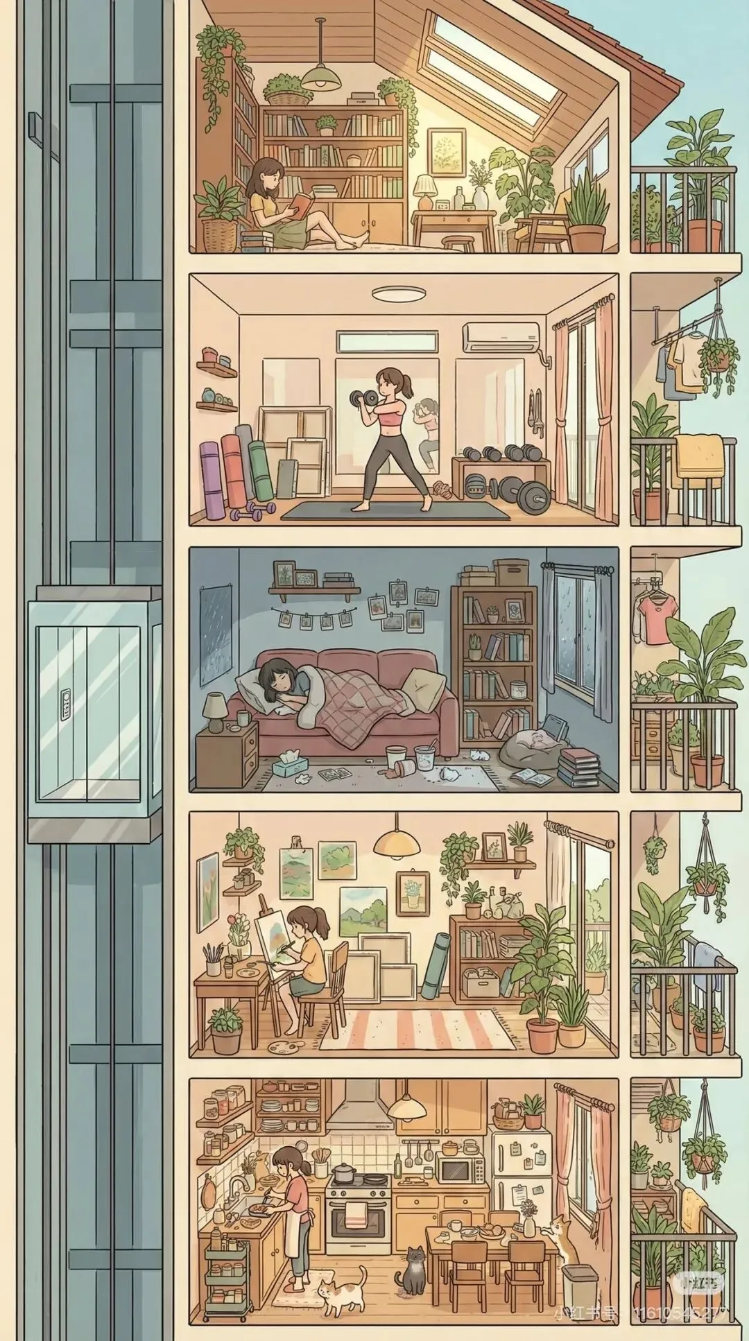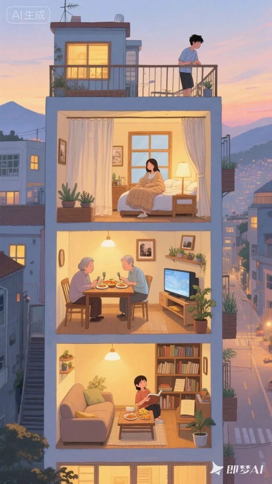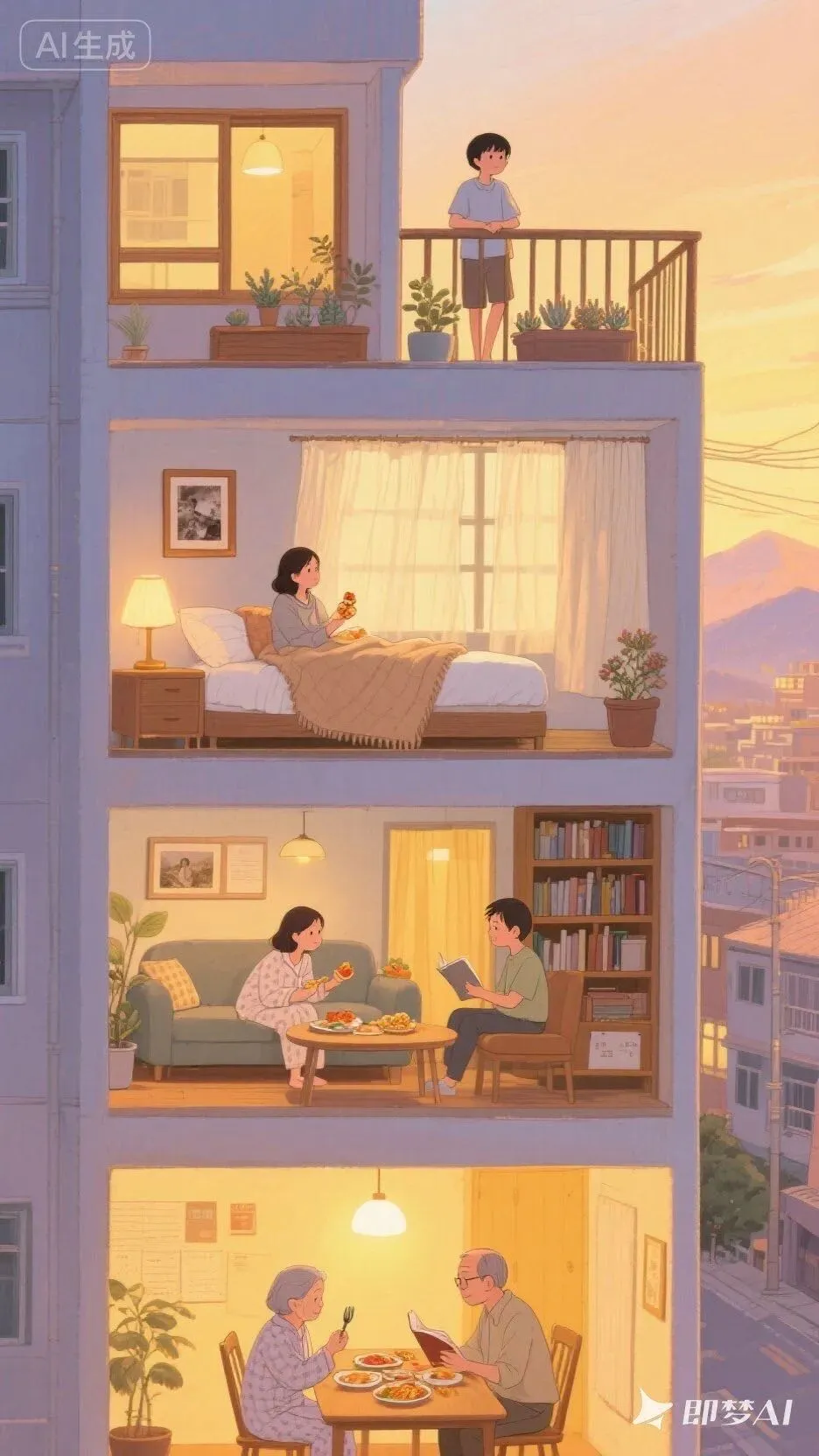 【👇提示词在此👇】帮我生成一张图片:高层公寓横截面全景插画:以水粉画细腻线条勾勒建筑轮廓,浸润吉卜力式暖光氛围,融入韩国插画大师独有的柔和色彩渐变。每层空间流淌着生活诗篇: 🎨一层暖黄灯光里,一老奶奶和老爷爷坐在餐桌,刀叉轻触间漫溢出食物香气;🎨二层层卧室垂落棉质窗帘,一女子盖着舒适毛毯,枕边台灯投下温馨光晕🎨三层女孩坐在沙发上边看电视边零食🎨四层书房男孩坐在在沙发中,指尖划过书页,案头盆栽随微风轻晃叶片;🎨顶层阳台少年倚着栏杆,看着街景全屋细节填满生活温度:木质相框里的旧照片、窗台错落的多肉植物、书架间隙露出的泛黄笔记本...暮色从远山漫来,为每扇窗镀上蜜色边缘,让平凡日常成为永不褪色的童话。