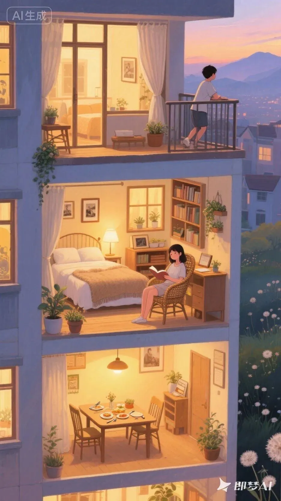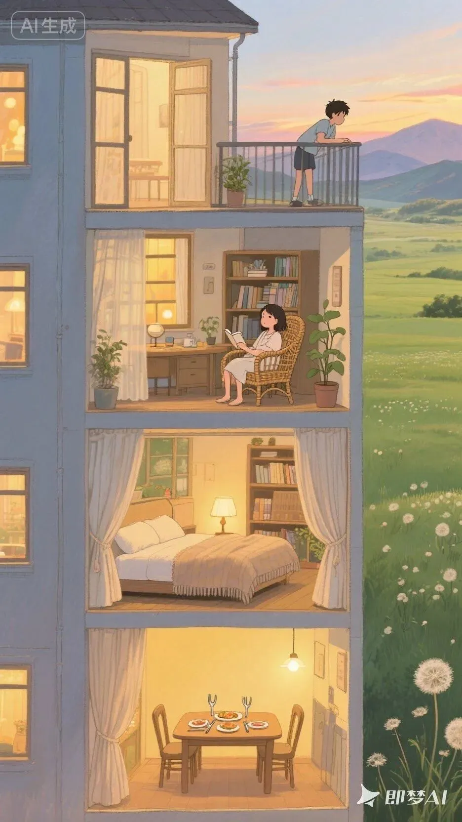 【👇提示词如下👇】帮我生成一张图片:高层公寓横截面全景插画:以水粉画细腻线条勾勒建筑轮廓,浸润吉卜力式暖光氛围,融入韩国插画大师独有的柔和色彩渐变。公寓静立辽阔绿野之上,远处山脉晕染天际。每层空间流淌着生活诗篇: 一层暖黄灯光里,对坐餐桌,刀叉轻触间漫溢出食物香气;三层层卧室垂落棉质窗帘,盖着舒适毛毯,枕边台灯投下温馨光晕;二层书房女孩蜷在藤椅中,指尖划过书页,案头盆栽随微风轻晃叶片;顶层阳台少年倚着栏杆,目光掠过遍野蒲公英全屋细节填满生活温度:木质相框里的旧照片、窗台错落的多肉植物、书架间隙露出的泛黄笔记本...暮色从远山漫来,为每扇窗镀上蜜色边缘,让平凡日常成为永不褪色的童话。比例 9:16。———————————————————————然后我又想让每一层楼都有人住!于是就做出了这样的。