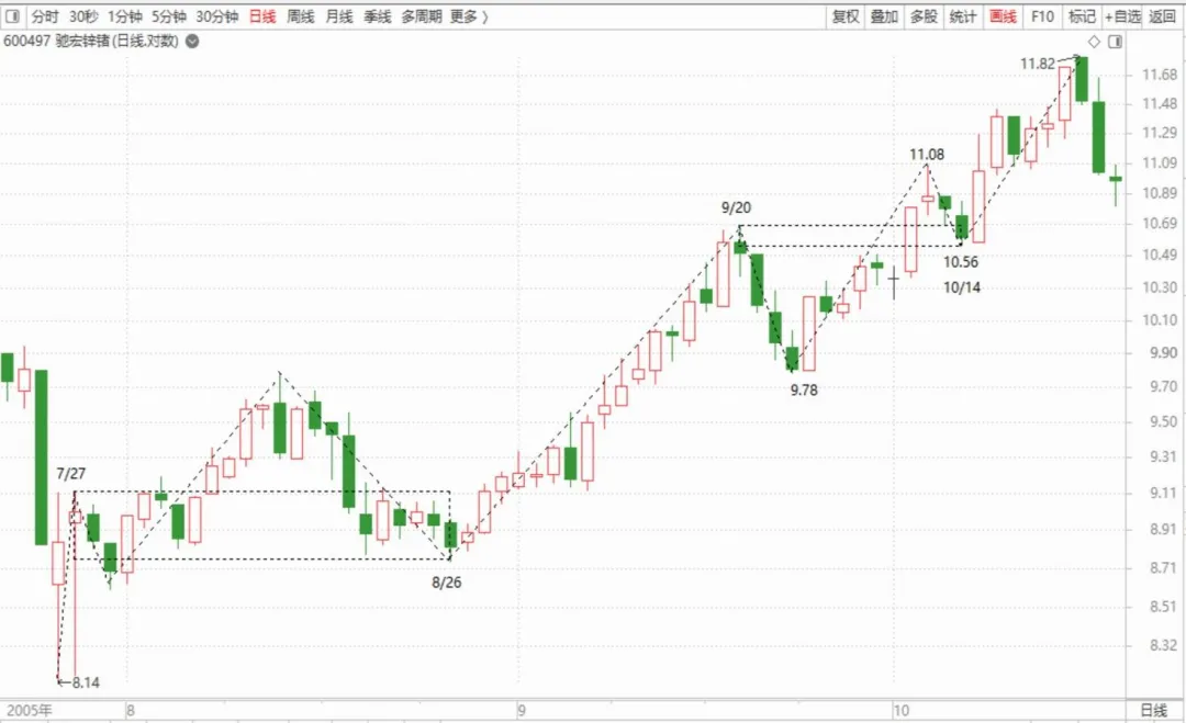 在此节实例中,有个600497的日线级别上涨,如下图:注:在此图上观照,是看不出来很明显的中枢的,按照定义中枢的是在次级别上分析的,本级别只能看到高低点的连线,这就是零师说的走势原貌。