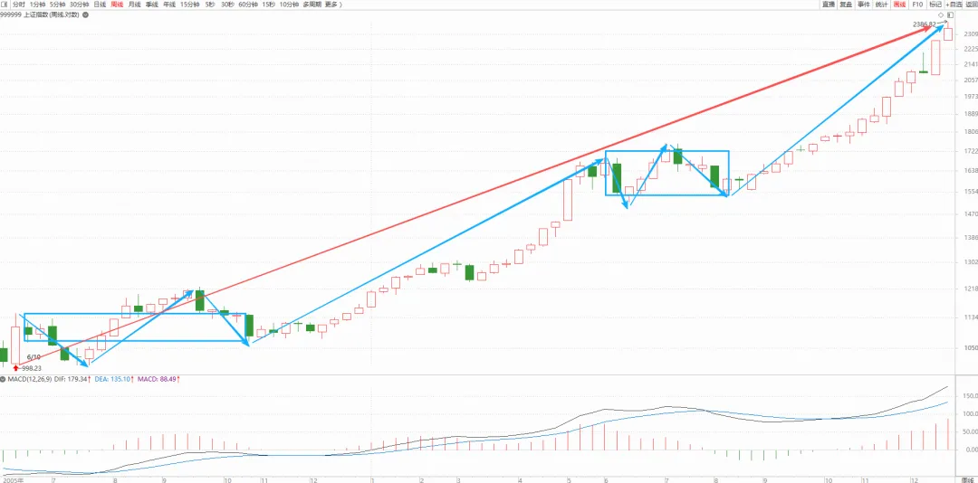答:周线见底后根本连一个中枢都没形成,因为都没有形成典型的日线级别连续三类型走势的重叠,那些都只是日线级别的中枢。这个意味着什么?意味着目前在周线级别上,只是一个大的走势类型的第一段,也和本ID一直强调的牛市第一波的判断是一致的。”
