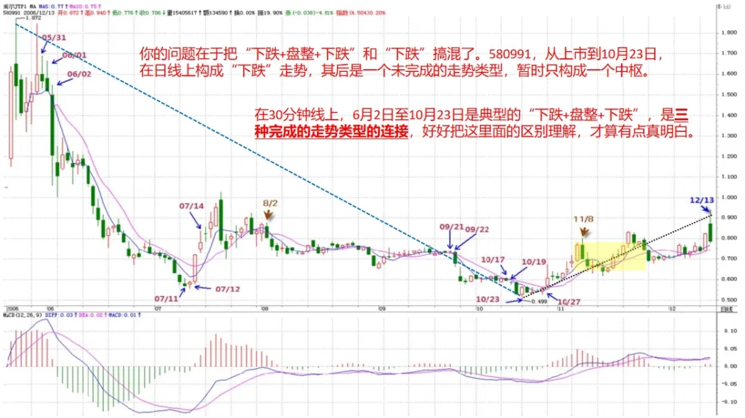 答:你的问题在于把“下跌+盘整+下跌”和“下跌”搞混了。580991,从上市到10月23日,在日线上构成“下跌”走势,其后是一个未完成的走势类型,暂时只构成一个中枢。而在30分钟线上,6月2日至10月23日是典型的“下跌+盘整+下跌”,是三种完成的走势类型的连接,好好把这里面的区别理解,才算有点真明白。