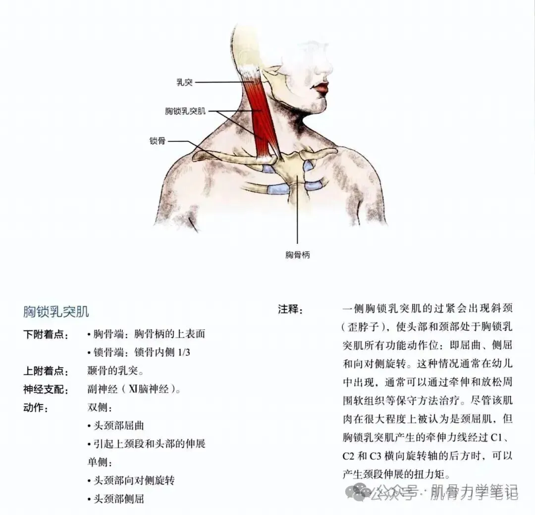 起止点:胸锁乳突肌有两个头——胸骨头起自胸骨柄上部前缘,锁骨头起自锁骨内侧1/3的上缘。