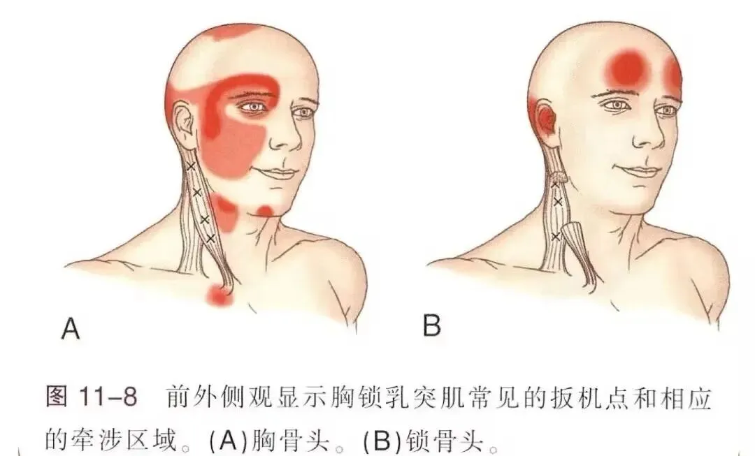 临床分析——扳机点与牵涉痛:胸锁乳突肌是头面部牵涉痛最常见的来源之一。其扳机点引起的疼痛往往不在肌肉局部,而是放射至远处:胸骨头扳机点常引起头顶部疼痛、眼部深处酸胀感、颞区疼痛,甚至出现视觉模糊;锁骨头扳机点则常引起前额痛、耳后痛、眩晕等。许多临床诊断为“紧张性头痛”“偏头痛”的患者,其根源往往可追溯到胸锁乳突肌的扳机点。因此,当患者主诉头痛、眼胀、面部不适而检查无明确原因时,应高度怀疑该肌肉。