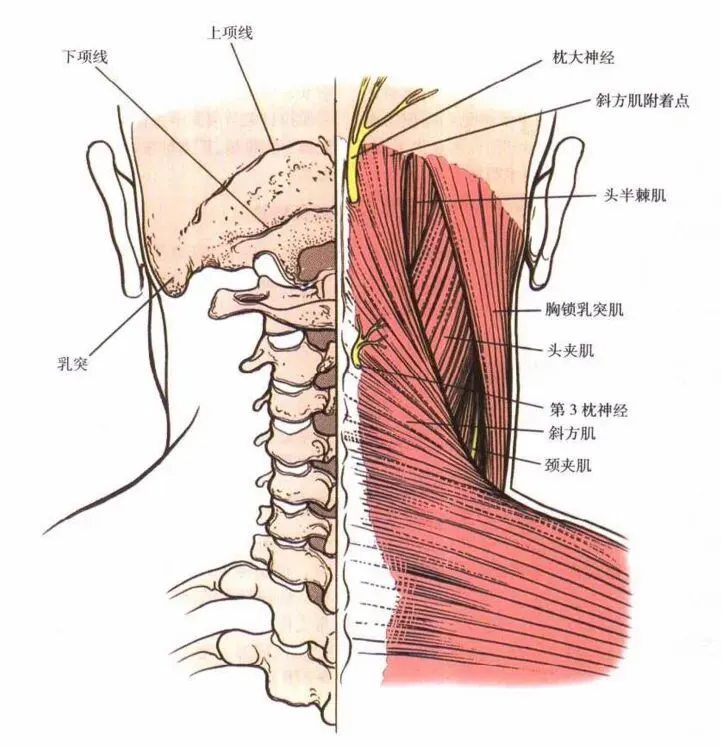 两个头向上后方汇合,止于颞骨乳突的外侧面以及枕骨上项线外侧半。这一附着特点使其成为连接躯干与头颅的桥梁。