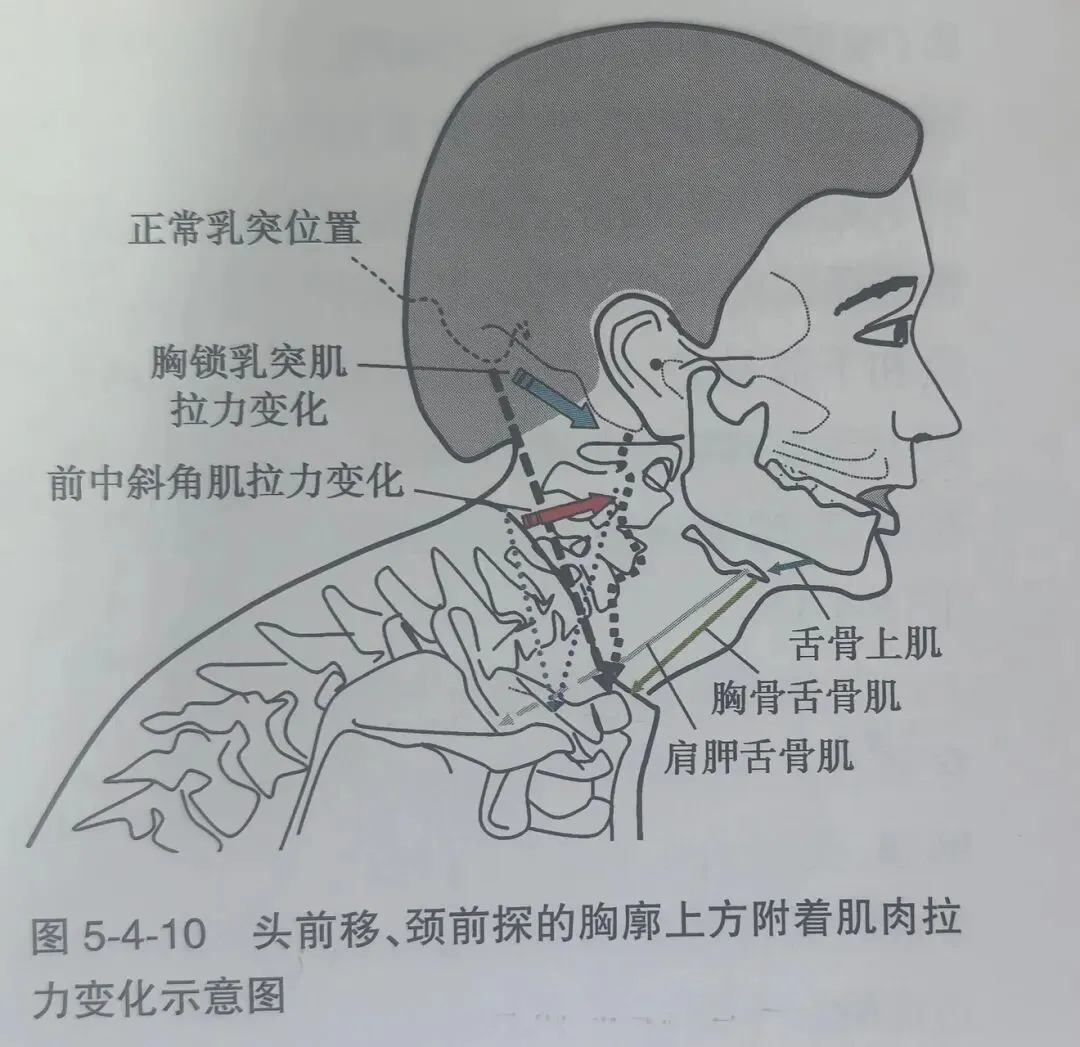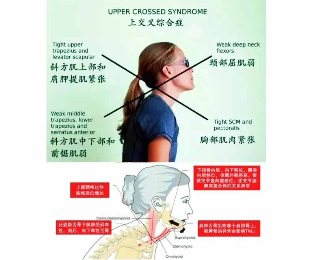 特别值得注意的是双侧胸锁乳突肌同时紧张时的生物力学效应:由于肌肉走行的方向,双侧紧张会使下颈椎(C4-C7)前屈,同时上颈椎(寰枢椎)后伸,形成“上交叉综合征”典型的姿势——头部前倾、下颈过屈、上颈过伸,这种姿势又会进一步加剧后方颈伸肌群的紧张和疼痛。