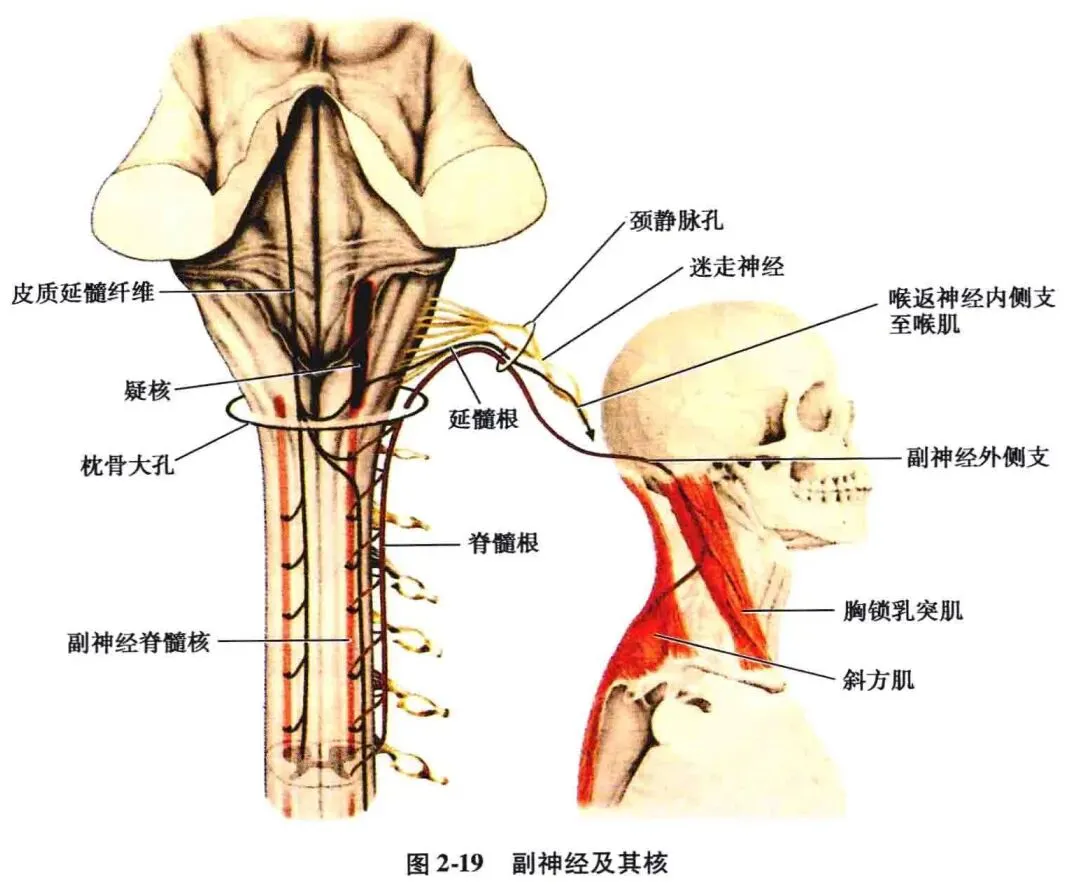 神经支配与卡压点:胸锁乳突肌受副神经(第十一对脑神经)支配。副神经由脊髓根和脑根汇合而成,经颈静脉孔出颅,随后。走行于胸锁乳突肌深面,支配该肌肉后再向后下方走行进入斜方肌。副神经在颈静脉孔周围以及出孔后的一段路径上,容易被周围筋膜卡压。