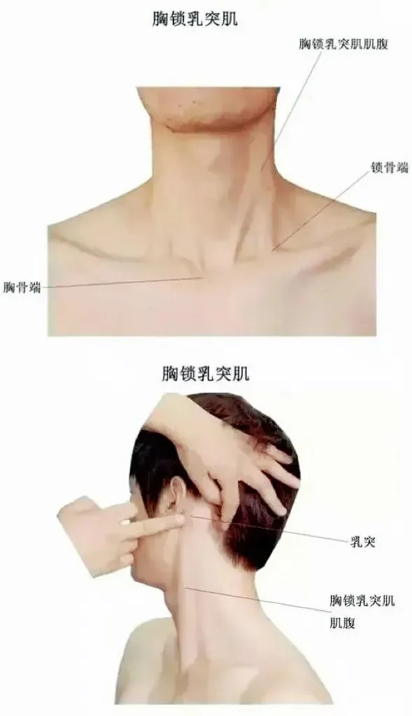 触诊与检查:患者取仰卧位,检查者将其头部向对侧旋转(如检查右侧,则头转向左侧),此时胸锁乳突肌清晰显露。从乳突开始,沿着肌肉走行向下可分别触及两个肌腹——内侧的胸骨头和外侧的锁骨头。用手指轻捏肌腹,可感知其张力,并探查是否存在条索状硬结或压痛点。抗阻检查:嘱患者轻微抬头前屈,同时施加阻力,可评估肌力及诱发疼痛。