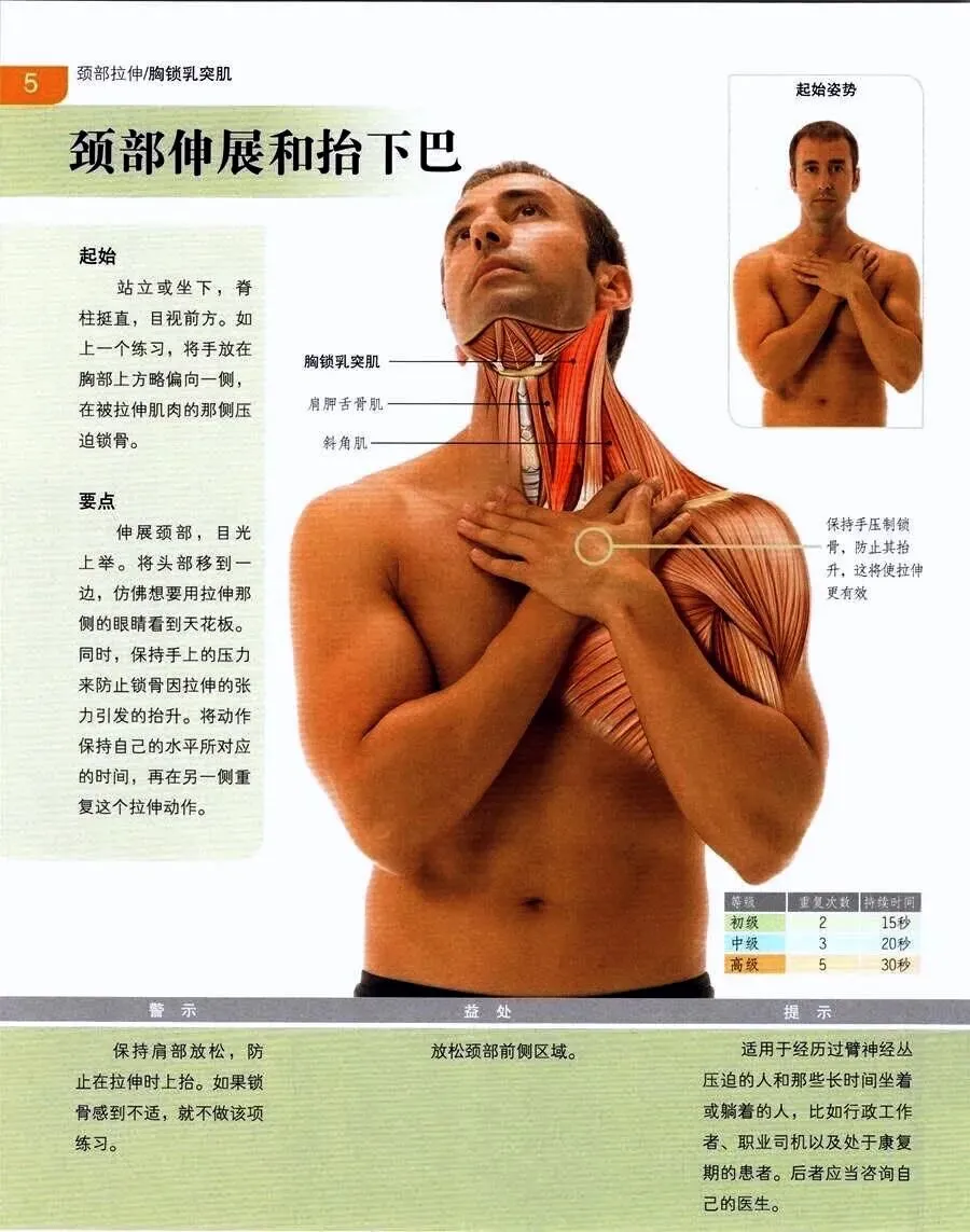 自我牵拉方法:以牵拉左侧胸锁乳突肌为例,患者可坐位或站位,将头向右侧侧屈,同时面部转向左侧,并微收下颌(轻微头前屈),此时可感到左侧颈部前方有明显牵拉感。保持15-30秒,重复数次。这一牵拉应在专业治疗后再配合进行,以巩固疗效。(配合MET技术效果更好)