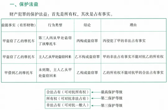 财产犯罪的保护法益包括:合法占有、所有权、非法占有。三者之间存在层级关系,刑法对不同主体的保护程度不同。