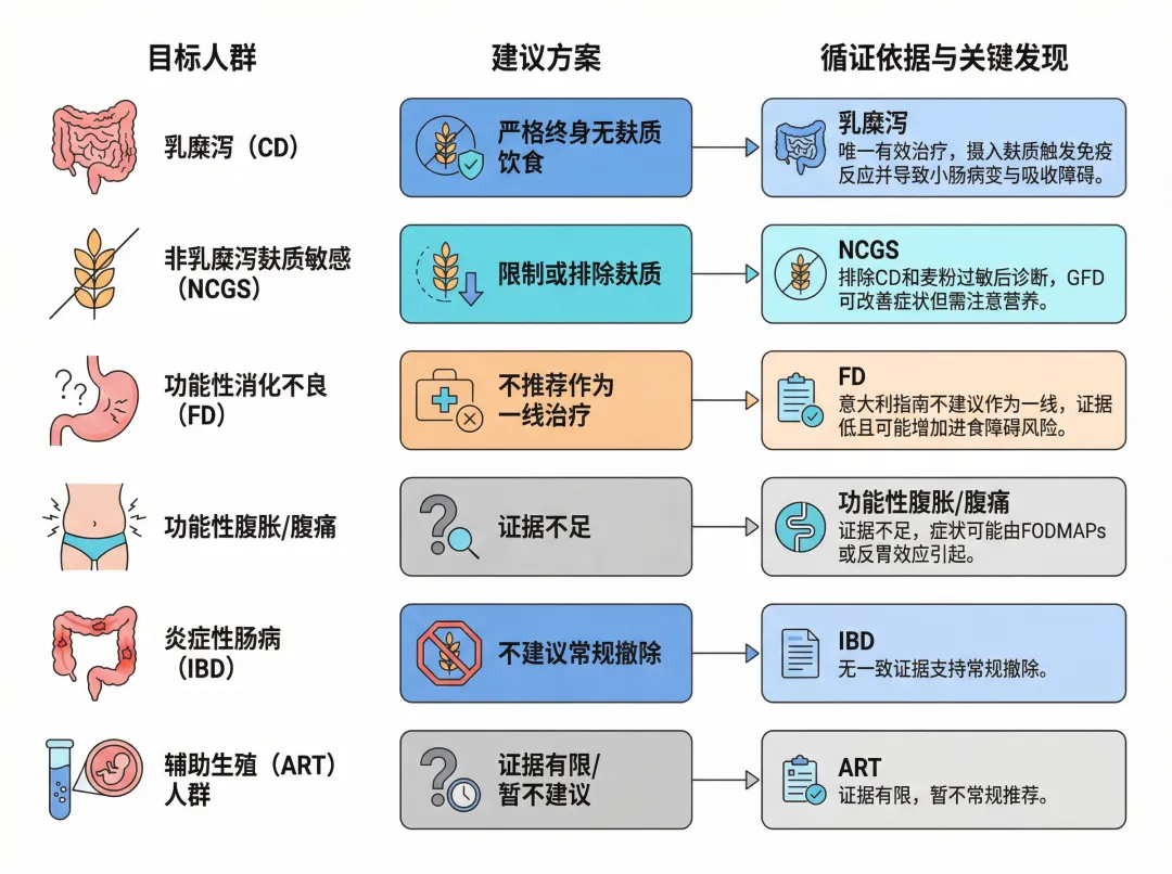 | 功能性消化不良 (FD) | 不推荐作为一线治疗 | 意大利指南建议不要将GFD作为FD患者的一线限制性饮食。虽然部分难治性患者可能获益,但证据质量极低,且可能增加进食障碍风险 14.114.2。 |