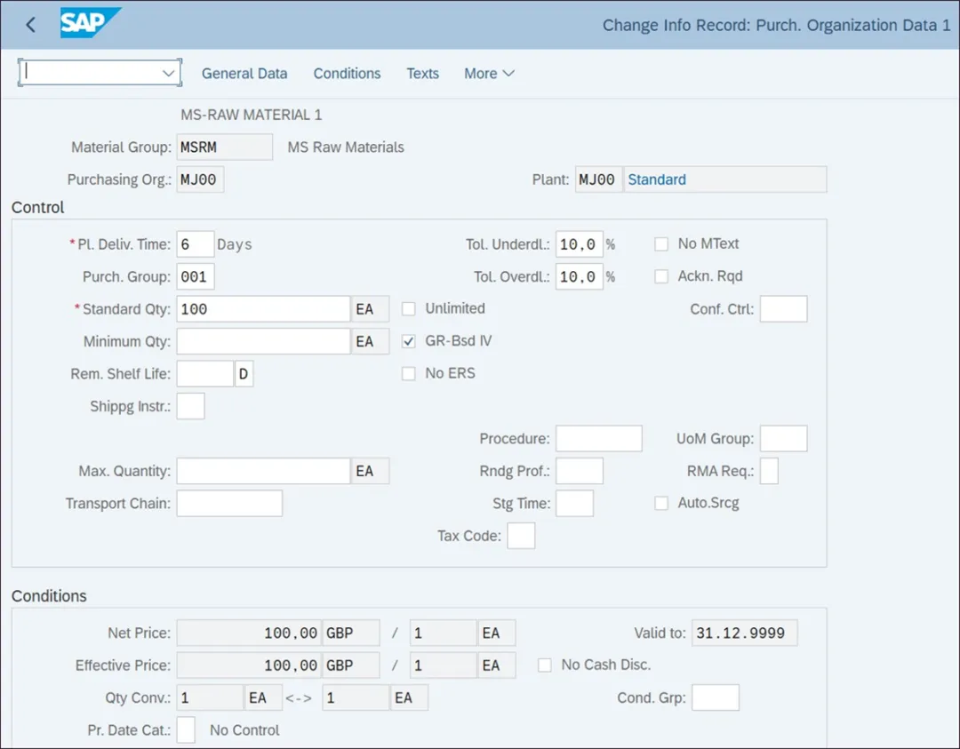 以下是该视图的关键字段:指定从采购订单日期起从供应商处收到物料所需的天数。以百分比形式指定欠交公差。如果供应商交付的数量少于订单数量且在欠交公差范围内,系统将接受交货并设置交货完成指示符。以百分比形式指定超交公差。如果供应商交付的数量多于订单数量且在超交公差范围内,系统将接受交货并设置交货完成指示符。从供应商处采购物料的标准订单数量应大于最小订单数量。标准数量用作分级价格的基础。在此字段中指定标准订单数量。这是从供应商处采购物料的最小订单数量。如果物料的采购订单数量小于信息记录中维护的最小订单数量,系统将不允许您创建采购订单。在此字段中指定最小订单数量。如果您设置此指示符,它将复制到采购订单项目的确认标签中。使用此指示符,您可以告知供应商他们必须使用所需的通信方式(电子邮件、信件等)确认收到采购订单。确认控制是采购数据的重要组成部分。它意味着期望从供应商处获得订单确认和/或提前发货通知(ASN)。下表显示了标准系统中定义的确认控制键;根据业务需求选择其中一个。自动发票结算(ERS)是一种使采购组织能够代表供应商参考收货项目过账发票的流程。如果在采购视图的业务伙伴供应商角色中设置了 ERS 指示符,则供应商无需为货物和服务采购提交发票。相反,采购组织根据采购订单参考收货数量自动过账发票接收。如果供应商设置了 ERS,但您不想为该特定物料启用自动化流程,则在信息记录中设置“无 ERS”指示符。如果您设置此指示符,系统在物料需求计划(MRP)运行期间会考虑此信息记录,前提是该信息记录存在于同一工厂中。在 MRP 运行期间,会参考该信息记录创建采购申请。在此部分,您可以在创建信息记录时首次直接维护净价(扣除折扣和附加费后的价格)。从下次开始修改或更新价格时,使用“条件”视图并维护具有有效期的修订定价条件。系统会根据定价条件自动得出有效价格的值。你若喜欢,点个❤️谢先👇
