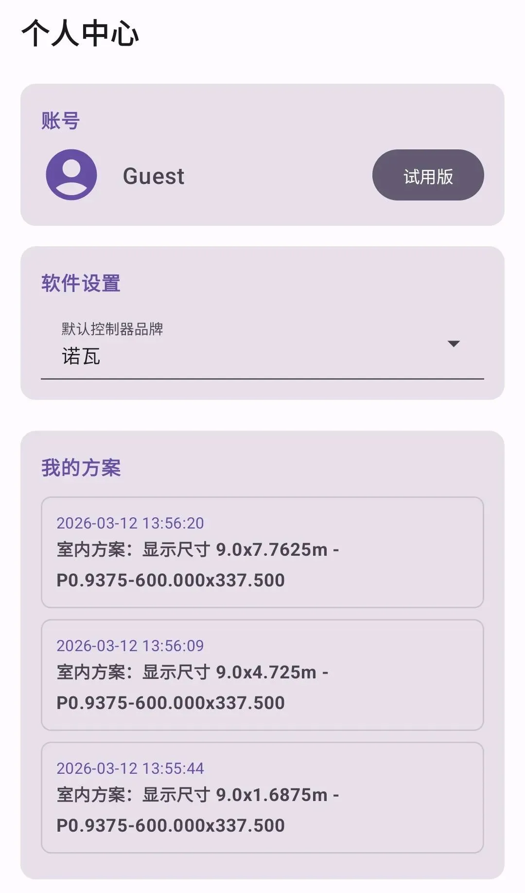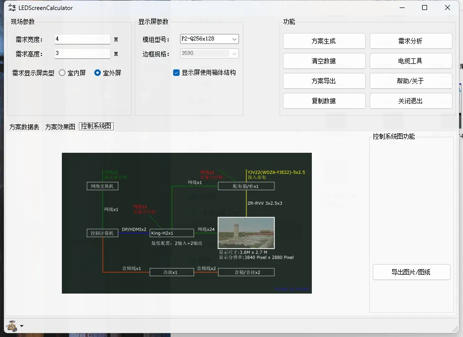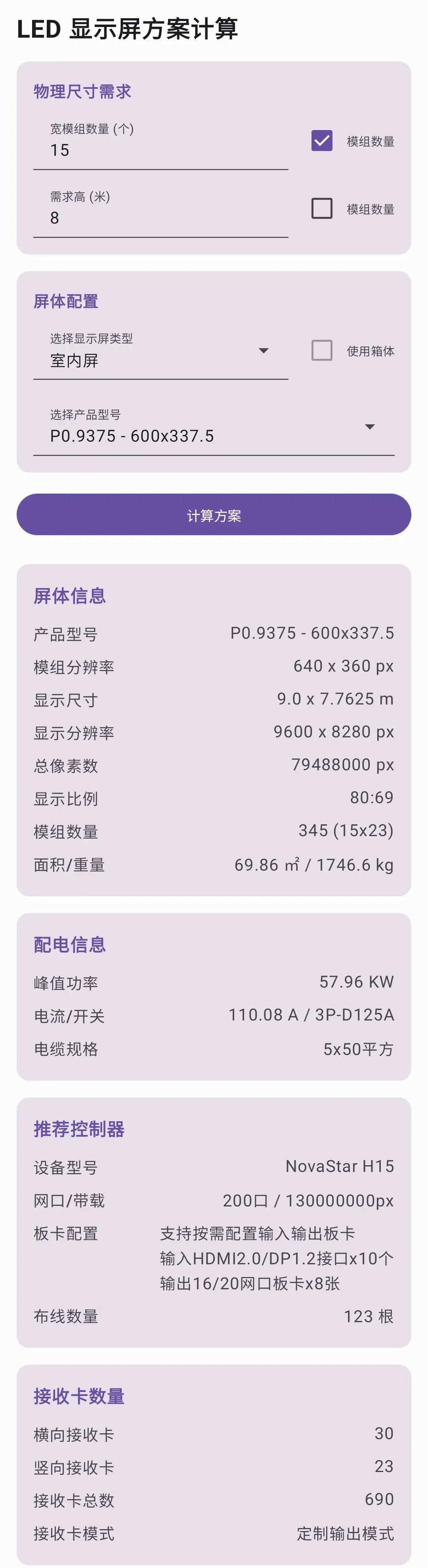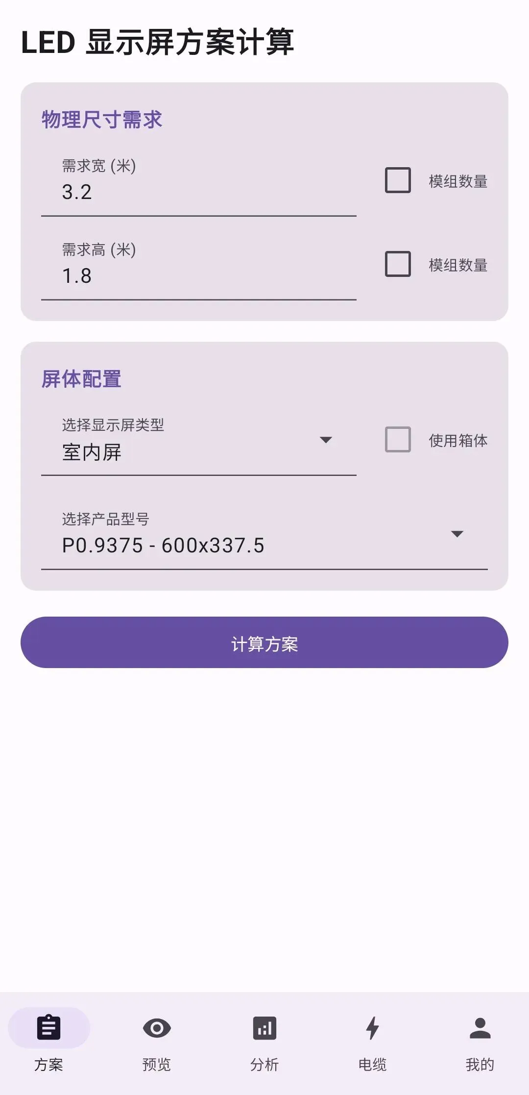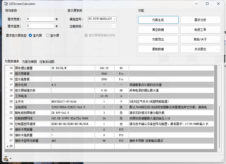 顺便说一句,这个我的方案列表,点击对应的方案时,会打开对应的方案,并将数据显示到方案界面中,方便在多个计算结果之间切换,这个对于经常帮客户算方案的兄弟们来说,应该算比较实用。为了方便管理方案列表,可以通过长按方案对计算结果进行改名保存。前面的各个功能模块之间的数据,都是支持联动的,比如在需求分析中通过输入100英寸,16:9的显示比例,计算出的宽度与高度,会自动填入方案计算中的需求宽与高中,直接选择对应的显示屏类型与产品型号,即可完成方案计算,方案计算完成后,示意图自动生成,同时功率数据也会自动同步到电缆计算界面中的功率输入框中,可以通过修改布线方式或需求的功率重新计算,计算完成后,可以直接将结果更新到方案中,更新后的整个方案会自动保存到我的方案列表中备查。