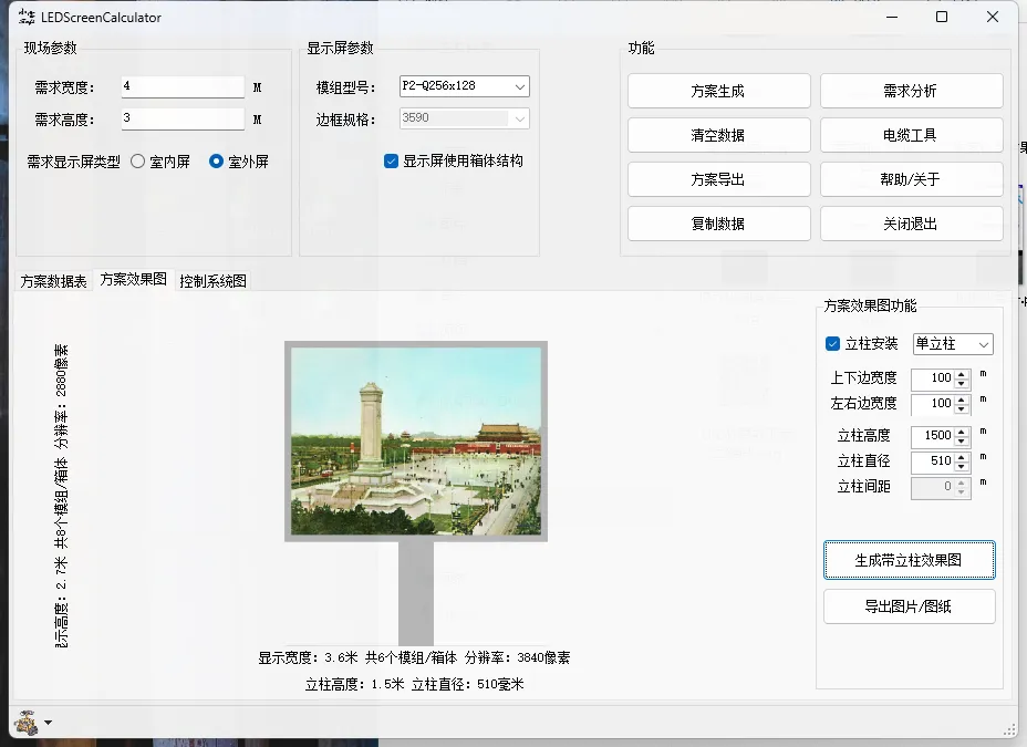这里有个特殊功能,在需求宽或高的后面,可以选择使用模组数量来进行计算,并且宽和高可以独立选择,如果知道宽,又知道高需要多少模组,就可以通过选择模组数量进行计算,如果同行朋友们要计算其它参数,这里相对C# 版本只能通过输入宽度/高度进行方案计算,算是一大改进。另外,这个使用箱体选项,一般情况下是用不到,为了方便管理产品参数数据,数据库中已将箱体的尺寸,列为产品型号了,所以一般情况下,用不到这个选项,除非是想独立计算一下接收卡对开带载时,需要的接收卡数量,那可以选上这个进行计算,当然这个只对非箱体的产品型号起作用。