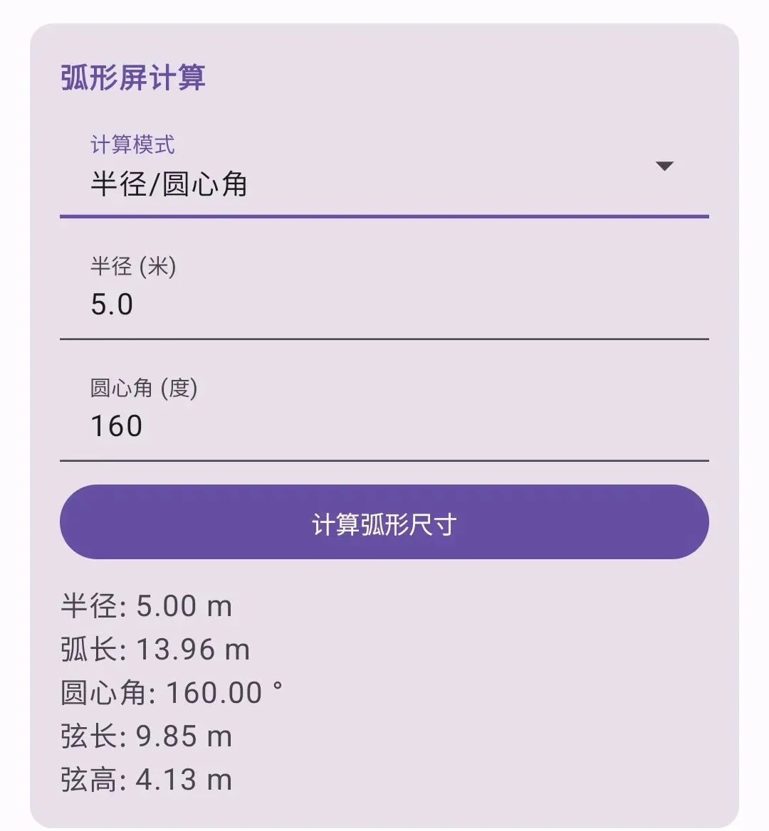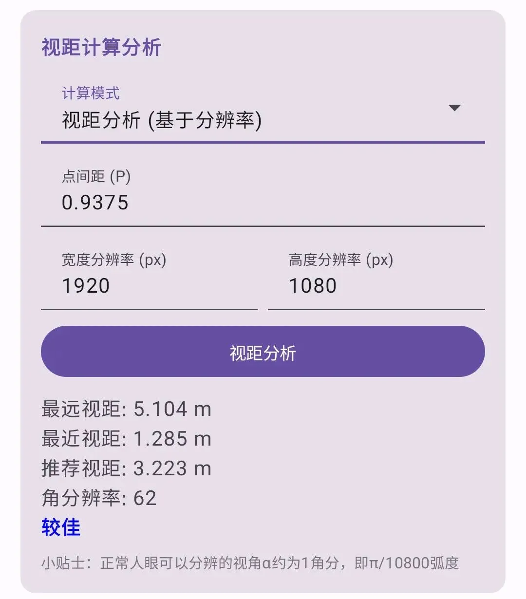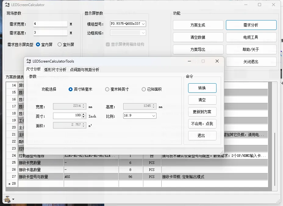 这是需求分析工具。可以将英寸按选定或输入比例转换为宽高,在毫米转英寸界面,还支持输入宽或高+选定或输入比例,直接换算出对应的高或宽,并计算出对应的英寸,使用已知面积模式时,只需要输入面积,选择或输入对应的比例,即可计算对应的宽与高的尺寸。弧形尺寸分析更是支持多种计算模式,包括:已知半径+圆心角/已知弦长+弧高/已知半径+弦长/已知弧长+半径等条件,分别计算出对应的弧长、弧高、弦长、半径、圆心角等参数。点间距与视距分析更是方便产品选型的必备功能。