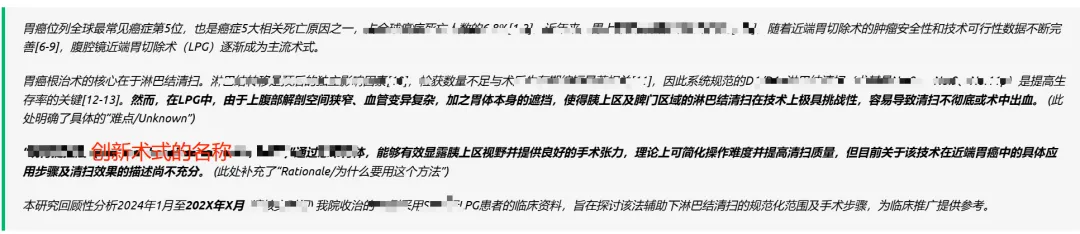 所以我们在创新术式时,一定要站在前人的肩膀上,指出目前该疾病的经典治疗方式是什么,效果如何;今天我们在应用传统治疗方式的过程中存在困难是什么;基于何种理念提出了自己的改良术式。这一点是有感于最近审阅的一篇文章,前言虽然清晰交代背景,但无法指出当前的不足和缺陷,也就成了为了报道技术而报道技术。这一点可以非常好地借助AI工具来理顺逻辑。