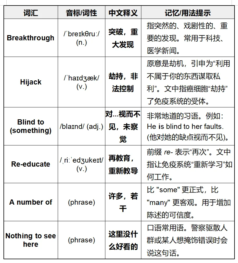 ◦注意文中主持人对嘉宾话语的解释(Paraphrasing)。例如,嘉宾说 "essentially tell the immune system to kind of take the brakes off",主持人随后用更简单的语言解释为 "unblocking our blocked natural defences"。这是英语听力中常见的“同义替换”技巧。