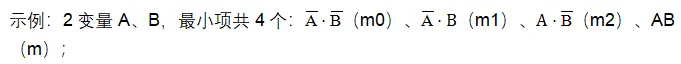 ① 最小项定义:n个变量的逻辑函数中,每个变量以原变量或反变量形式出现一次,且仅出现一次的乘积项(n个变量共有2ⁿ个最小项,记为mᵢ,i为该最小项对应的二进制数的十进制值);