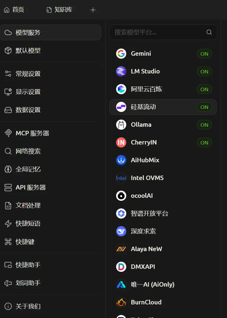 在CherryStudio的设置中,第一栏就是模型服务,在这里选择对应的API平台,填入API地址、密钥等就能配置好,然后点击添加模型,通常只需要填入模型名称即可,模型名称建议直接从网页复制,否则容易写错。配置好以后,建立知识库时就能直接选。