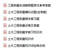 今天分享的资料是「0618-土木工程测量」电子版+学习笔记+知识点总结+期末考试重点+复习资料+习题集及答案+名词解释+历年真题试卷及答案+题库及答案+复习重点+思考题及参考答案+公式总结+考试重点基础题+知识总结+高清PDF可打印+免费分享!
