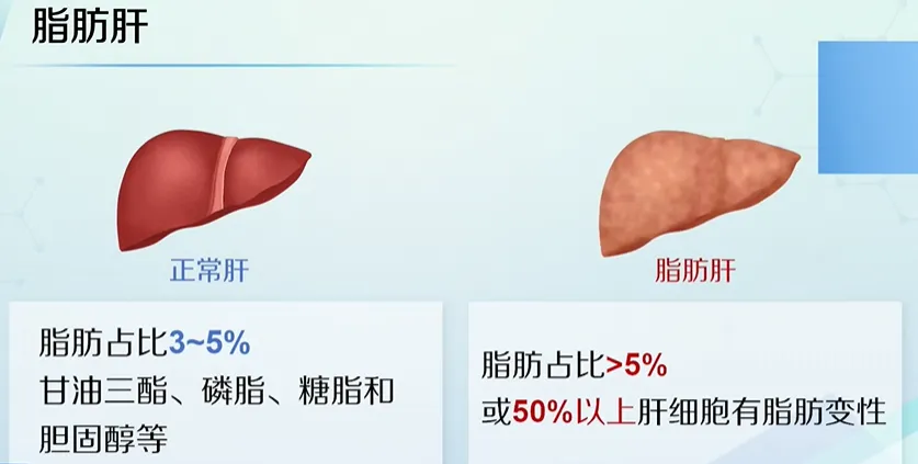 正常情况下,肝脏内的脂类(包括甘油三酯、磷脂、胆固醇、糖脂)仅占肝重的 3%~5%;当脂类含量超过肝重 5%,或肝细胞内脂肪占比达到一半时,就可诊断为脂肪肝。